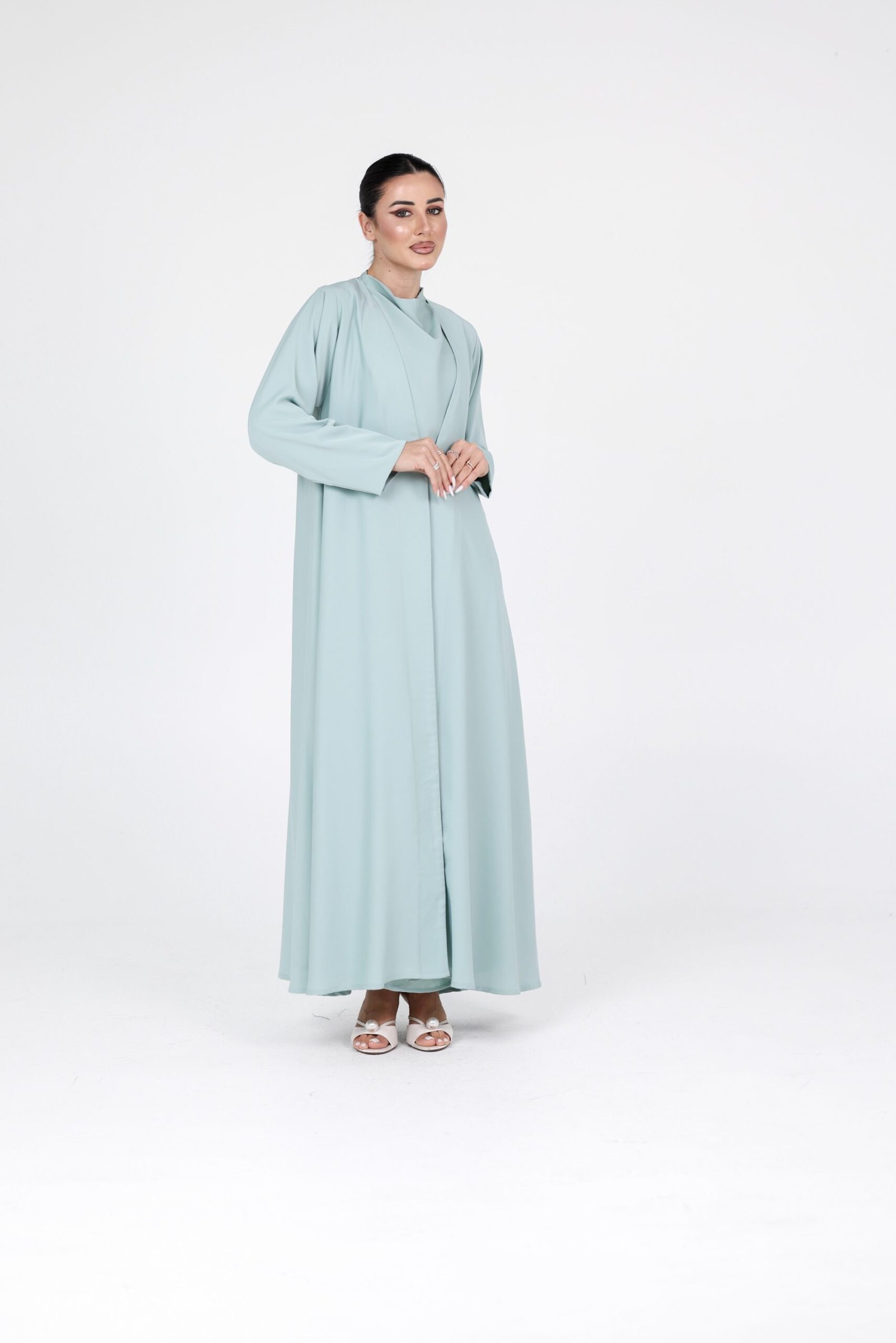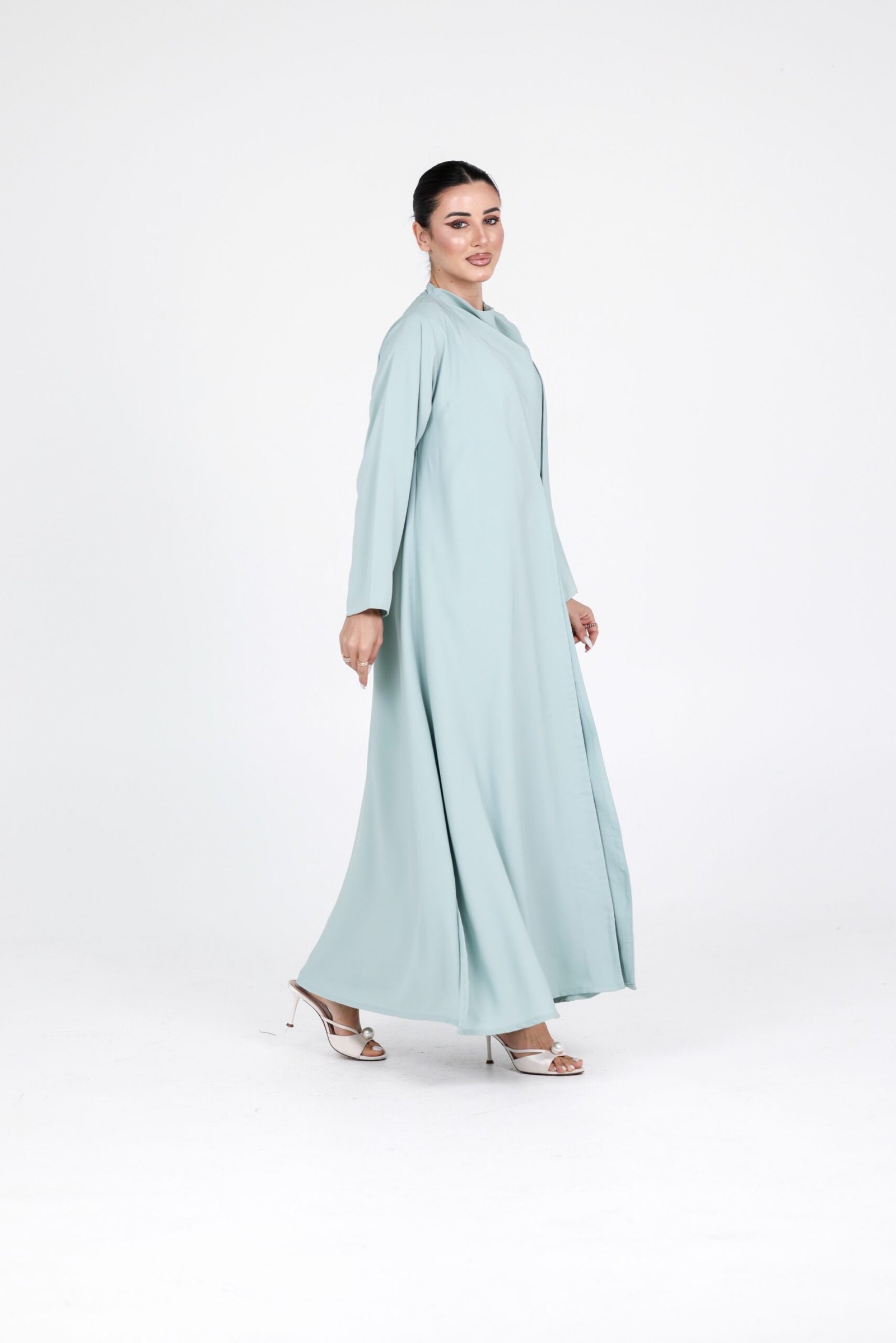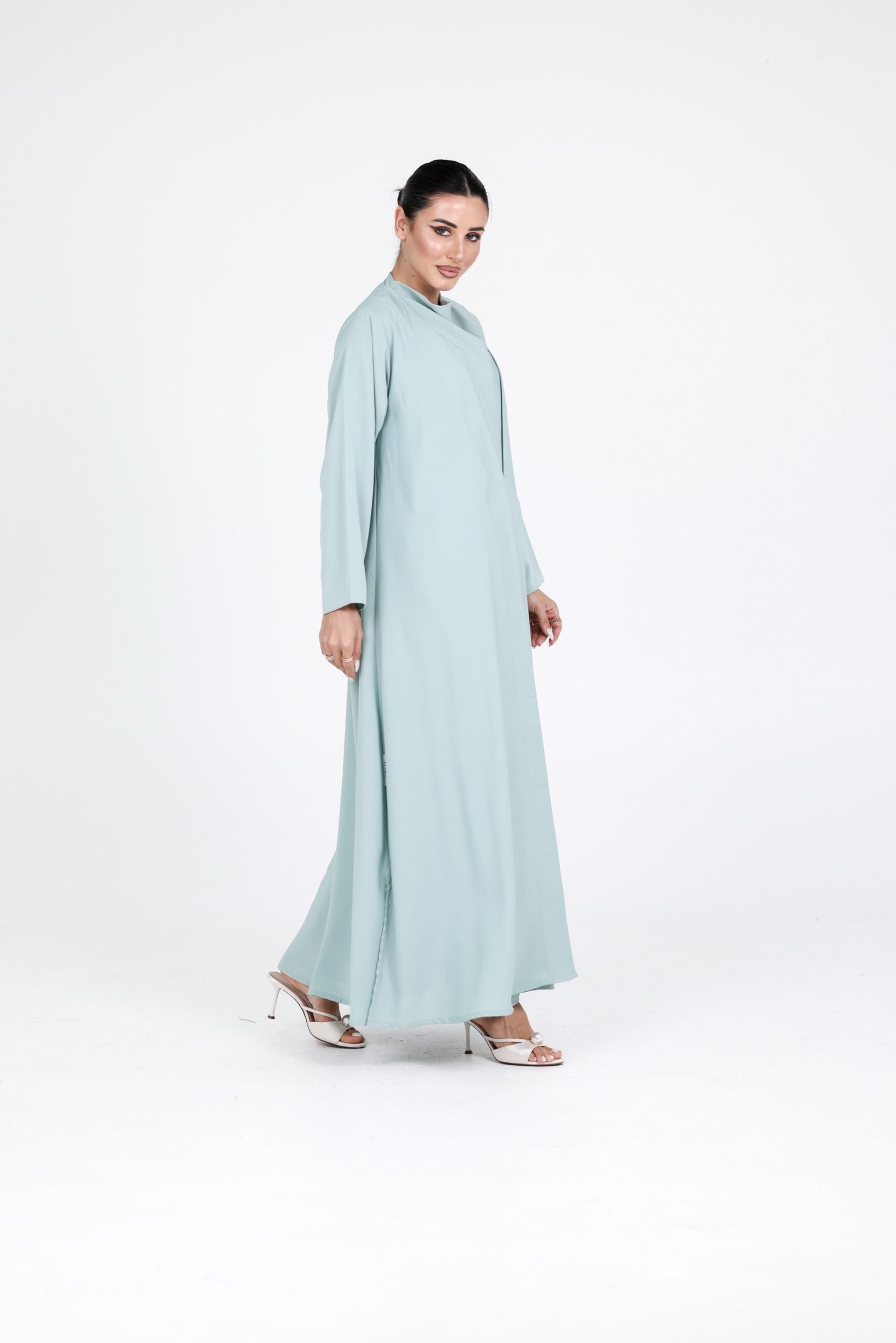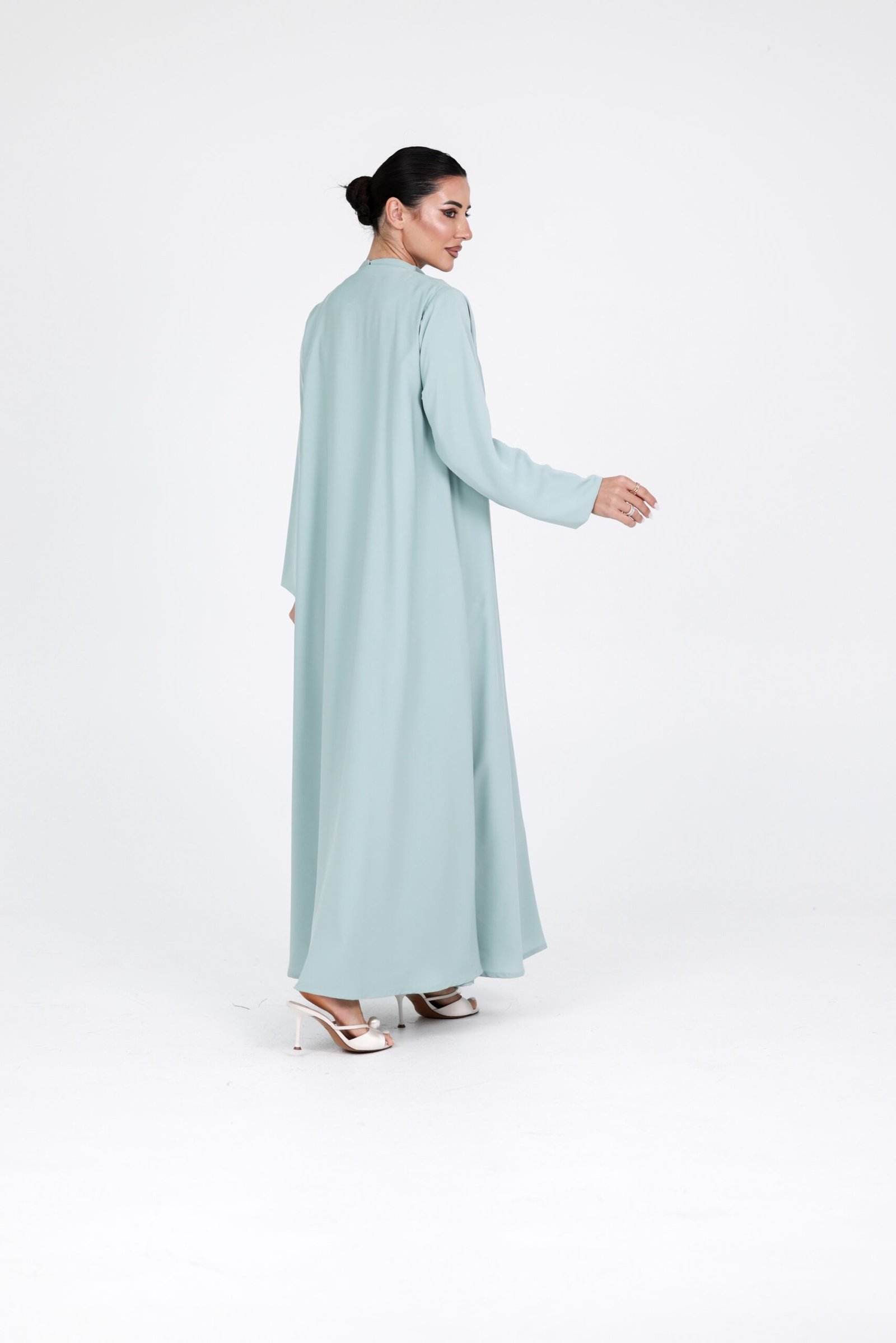 A minimalist abaya designed with a soft, flowing silhouette that reflects effortless elegance. The clean cut highlights the beauty of simplicity, creating a timeless piece suitable for any occasion.