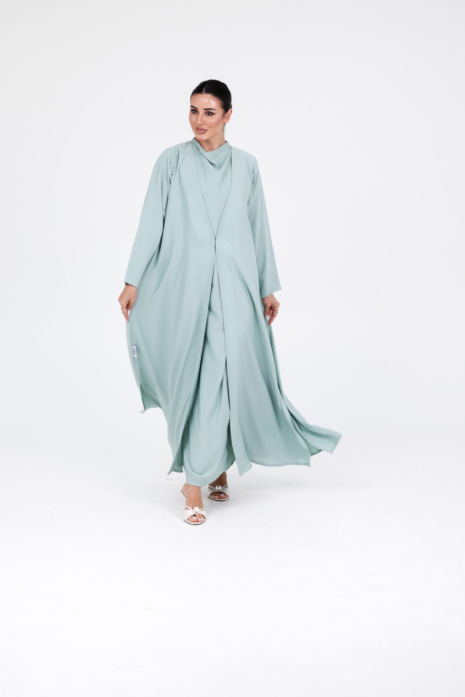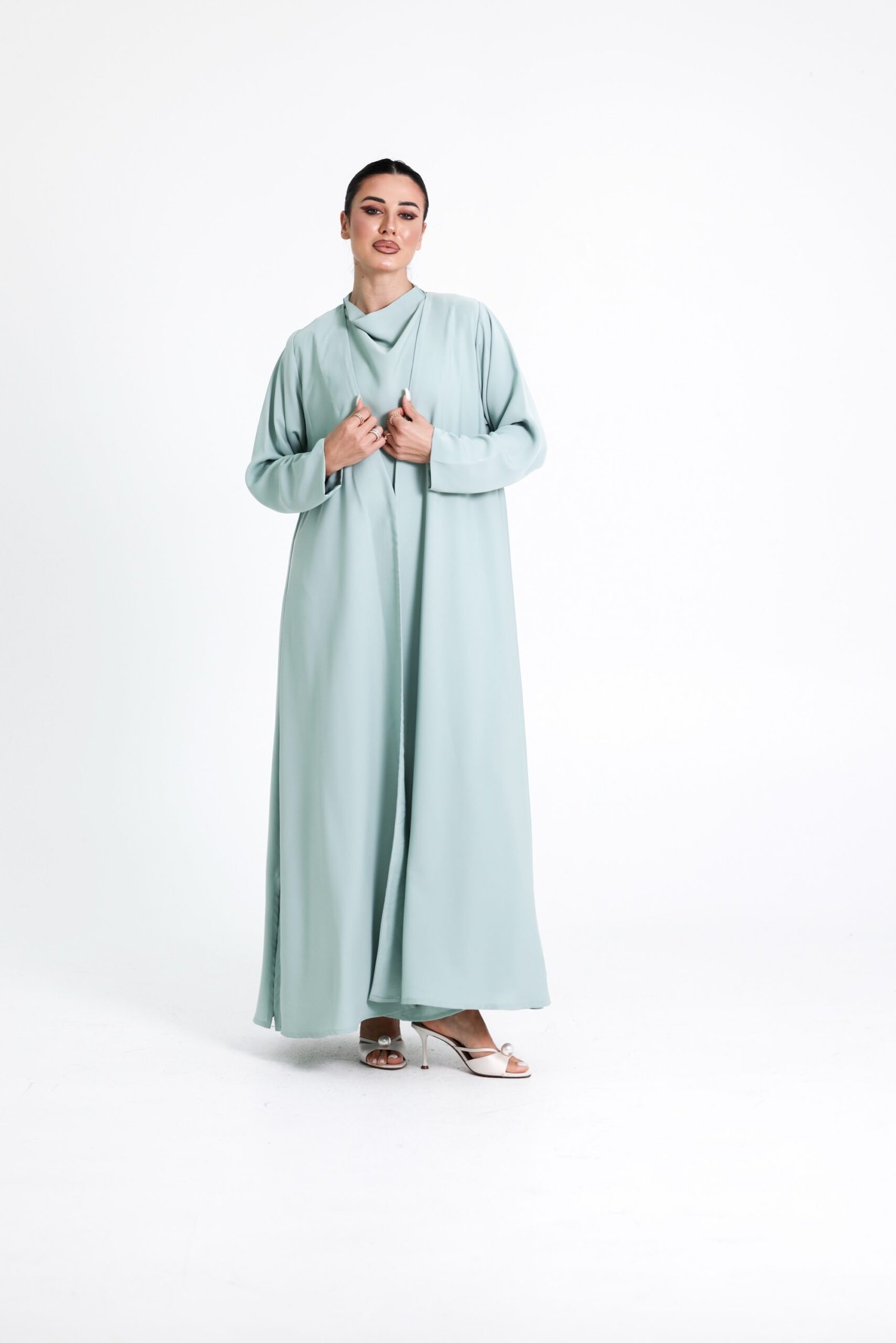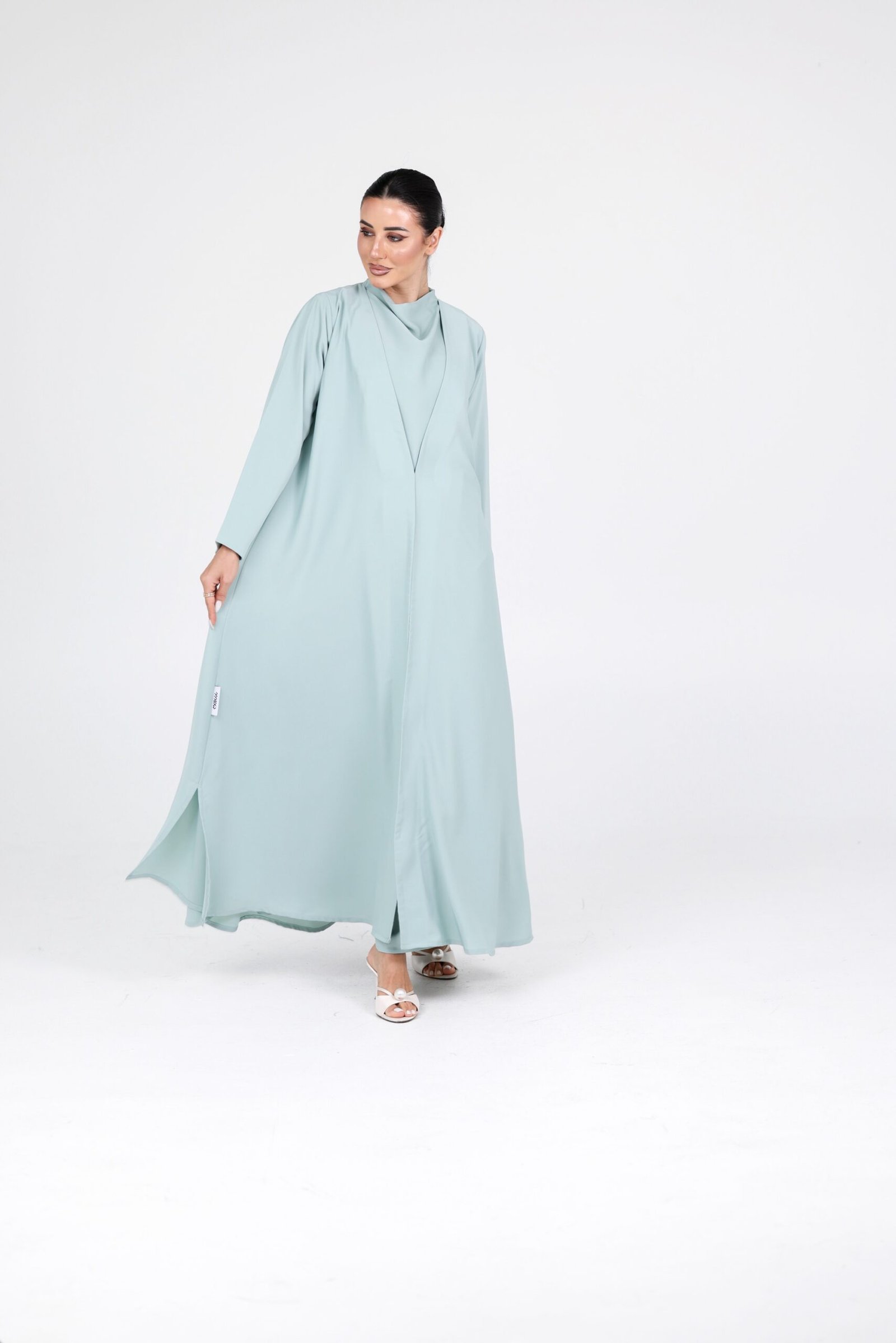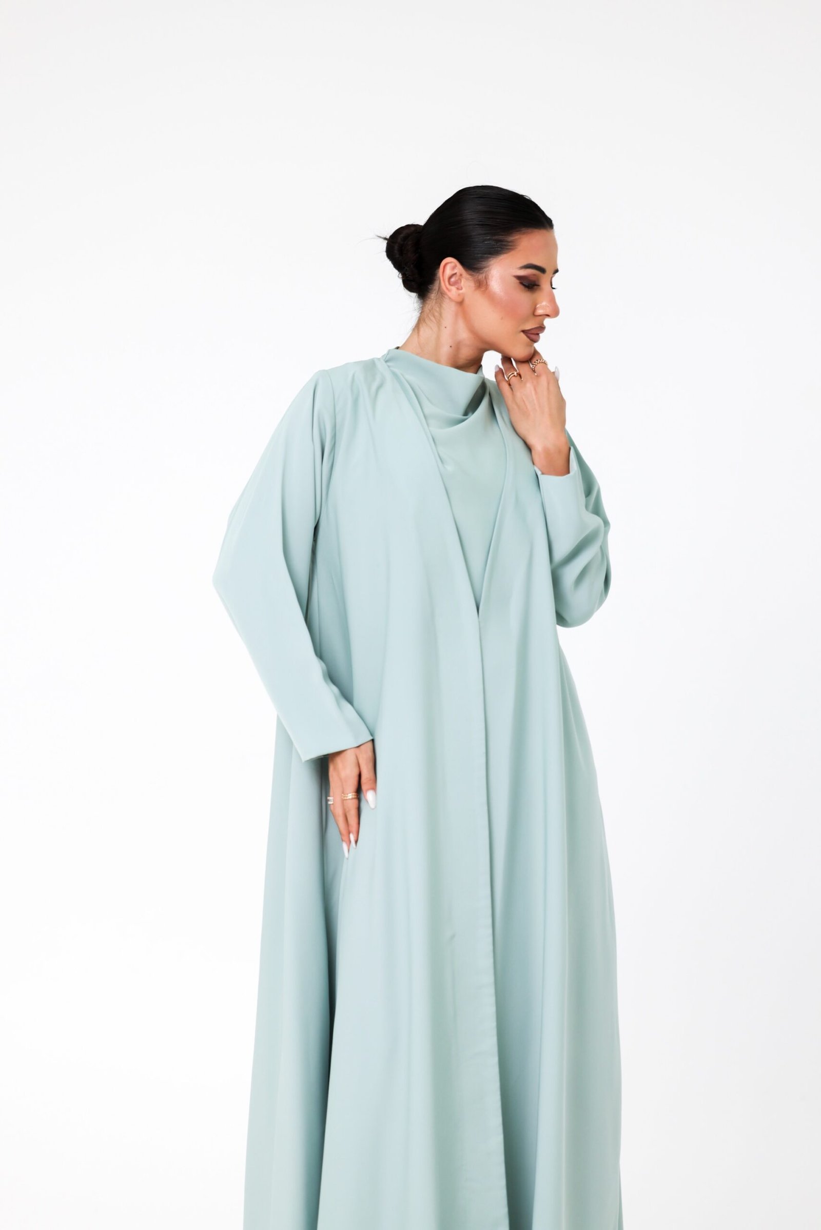 A minimalist abaya designed with a soft, flowing silhouette that reflects effortless elegance. The clean cut highlights the beauty of simplicity, creating a timeless piece suitable for any occasion.