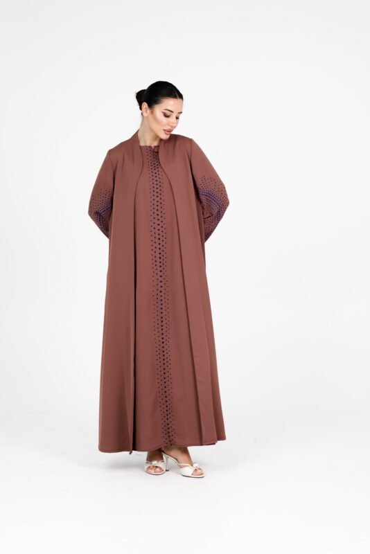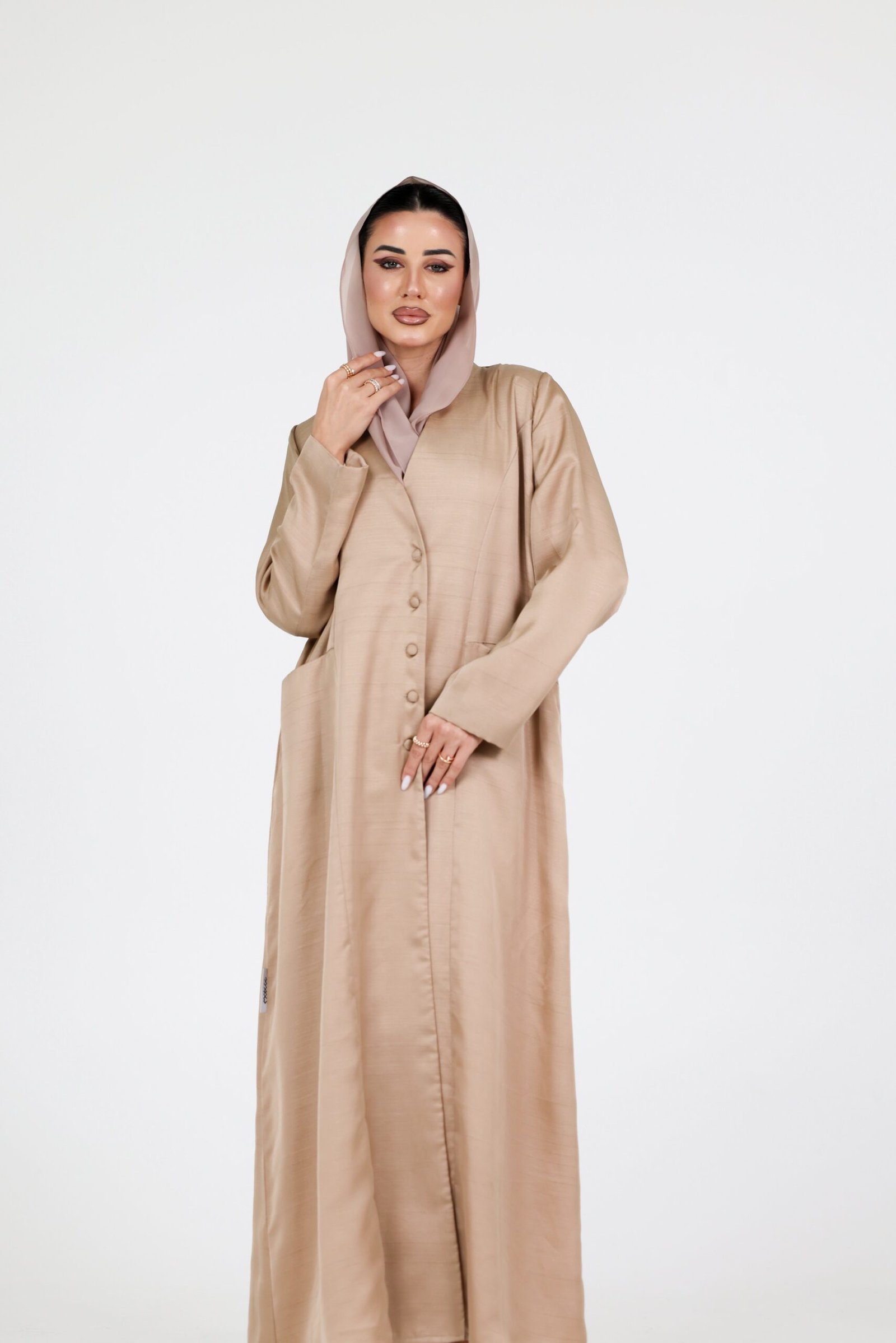 A refined everyday abaya designed with a clean, tailored silhouette that blends comfort with understated elegance. Featuring a structured front with soft button detailing and practical side pockets, this piece offers effortless wear with a polished finish.
