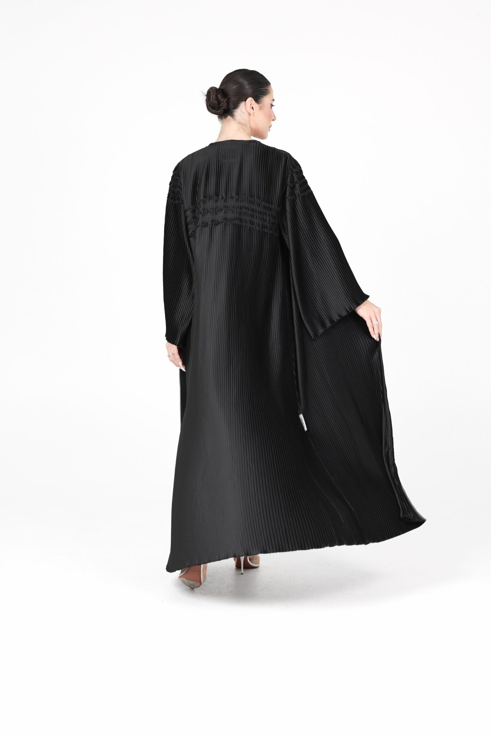 A statement abaya crafted from structured silk with a refined pleated texture that adds depth and movement to the design. The vertical pleats create a sleek, elongating effect while maintaining a modern and elegant silhouette.