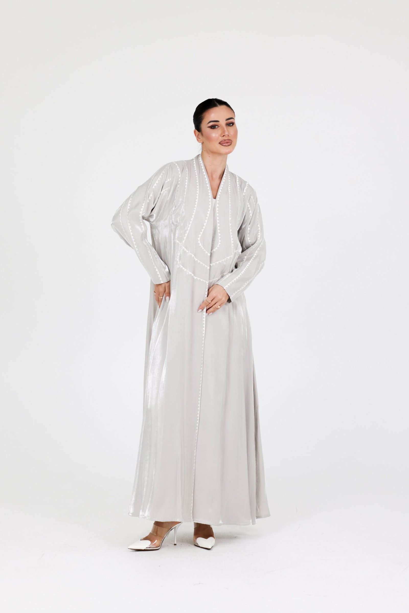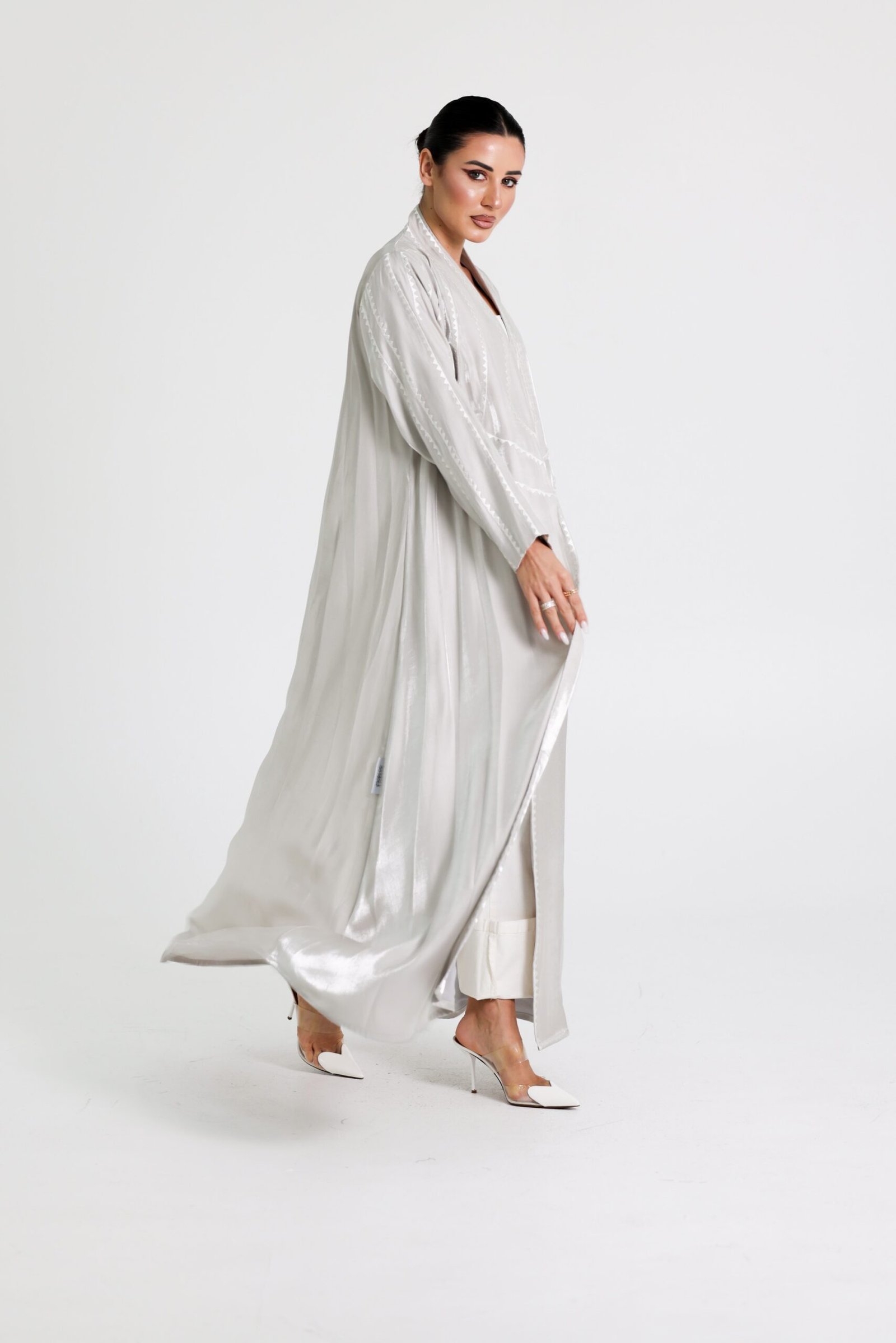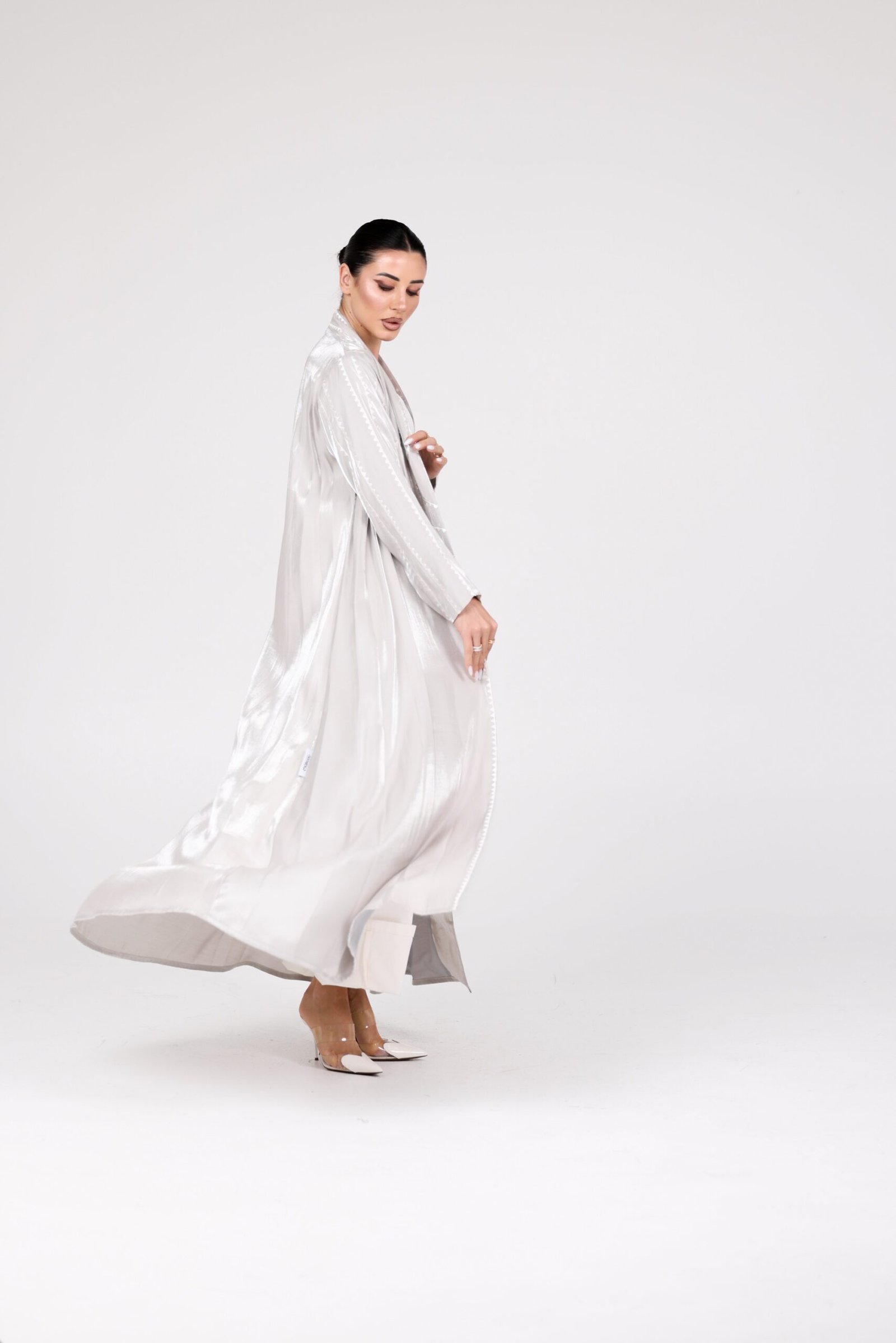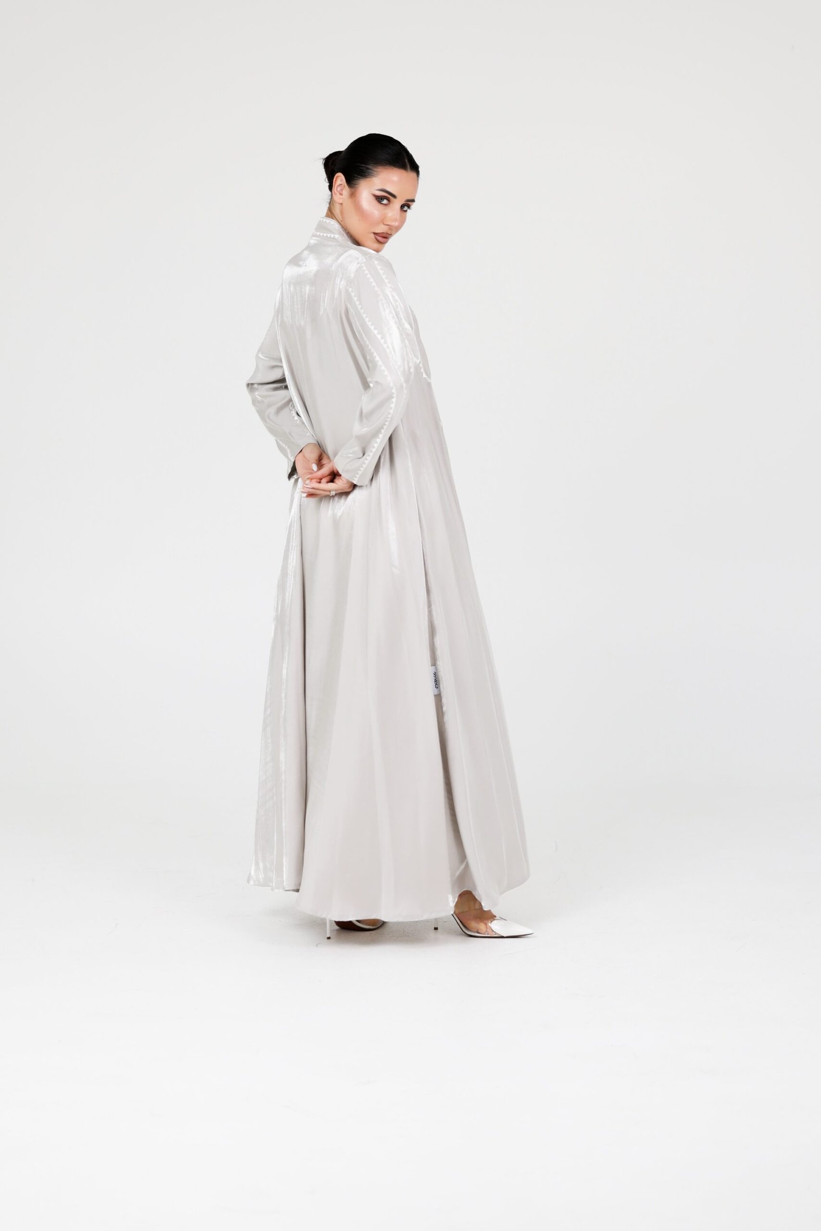 A luxurious abaya crafted from premium organza fabric, designed with a flowing silhouette that moves with elegance and grace. The subtle sheen of the fabric, combined with delicate detailing along the edges, creates a refined and sophisticated statement.