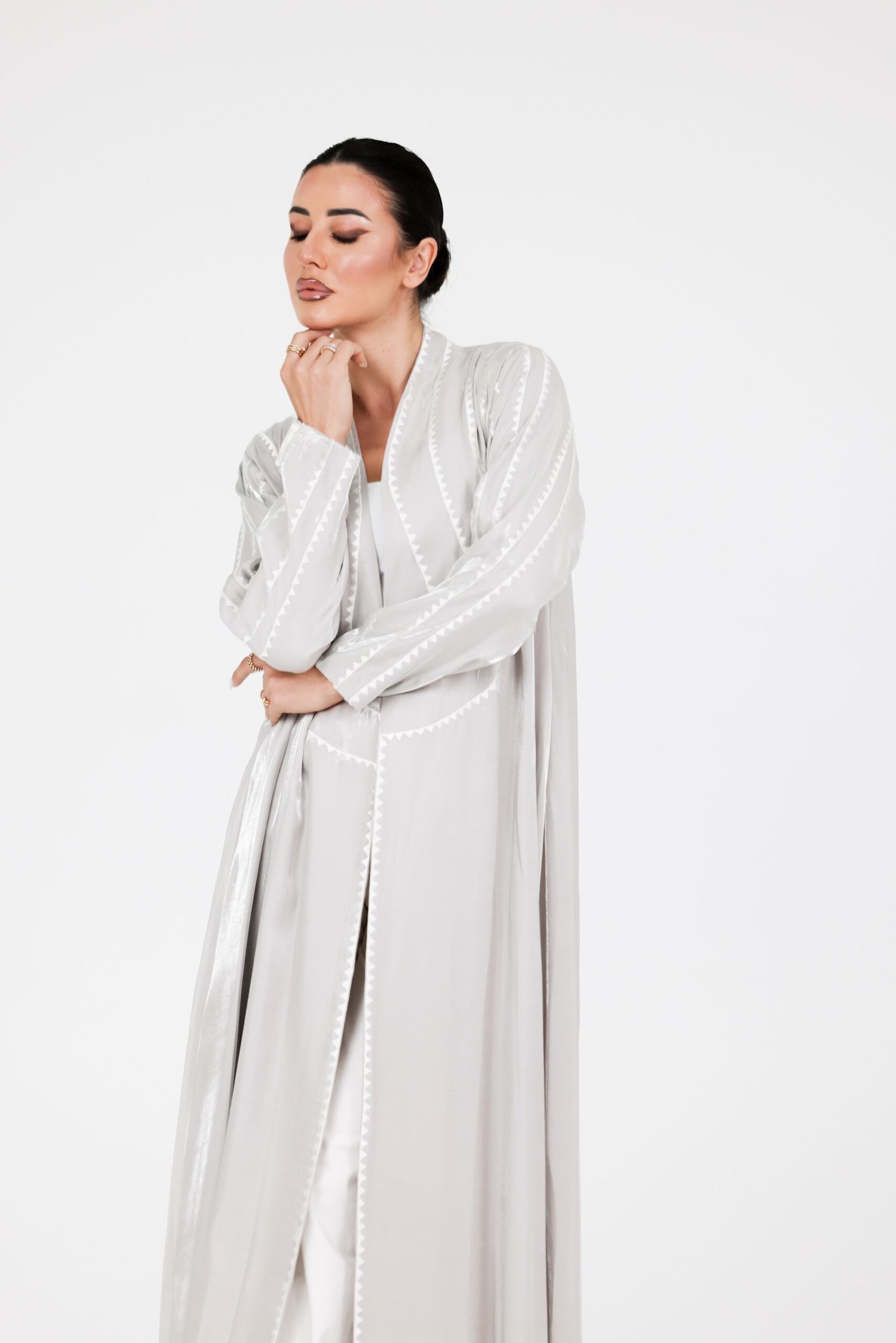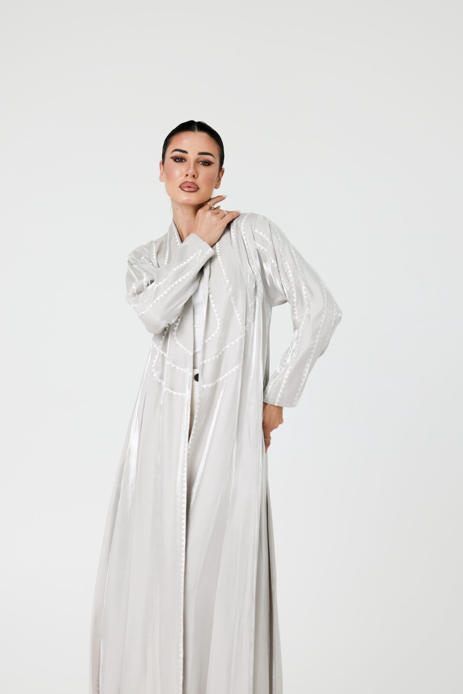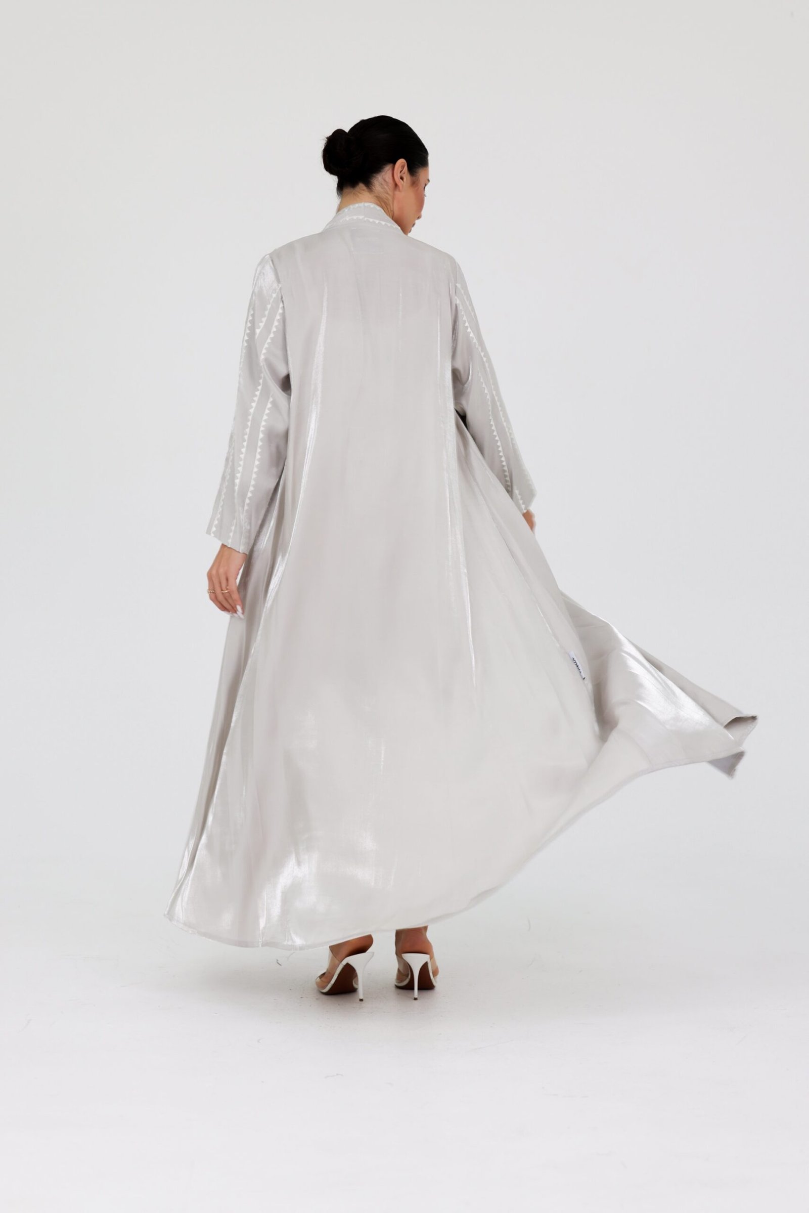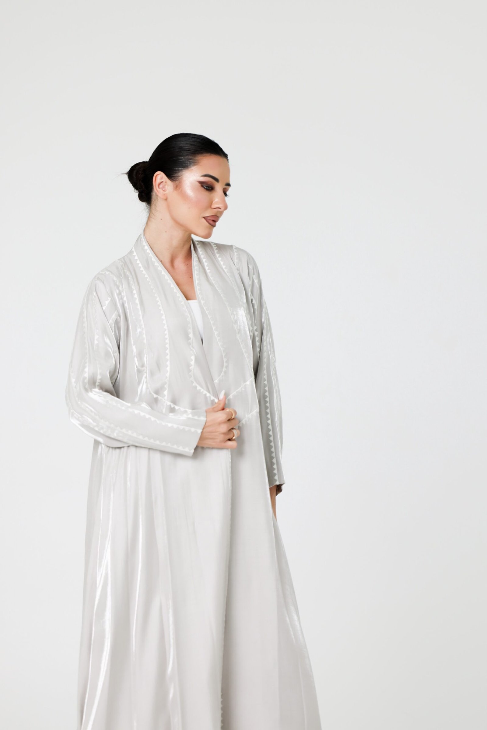 A luxurious abaya crafted from premium organza fabric, designed with a flowing silhouette that moves with elegance and grace. The subtle sheen of the fabric, combined with delicate detailing along the edges, creates a refined and sophisticated statement.