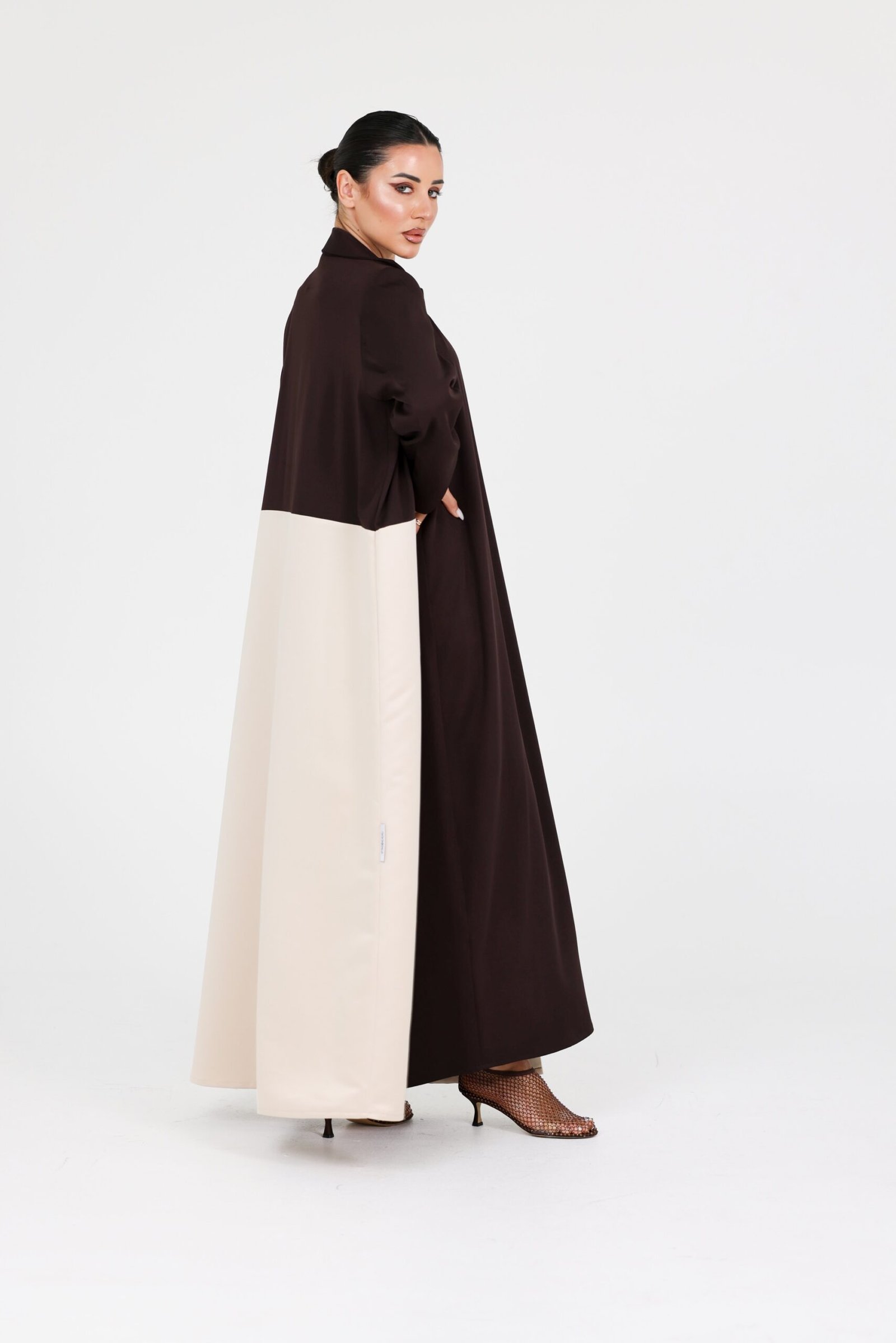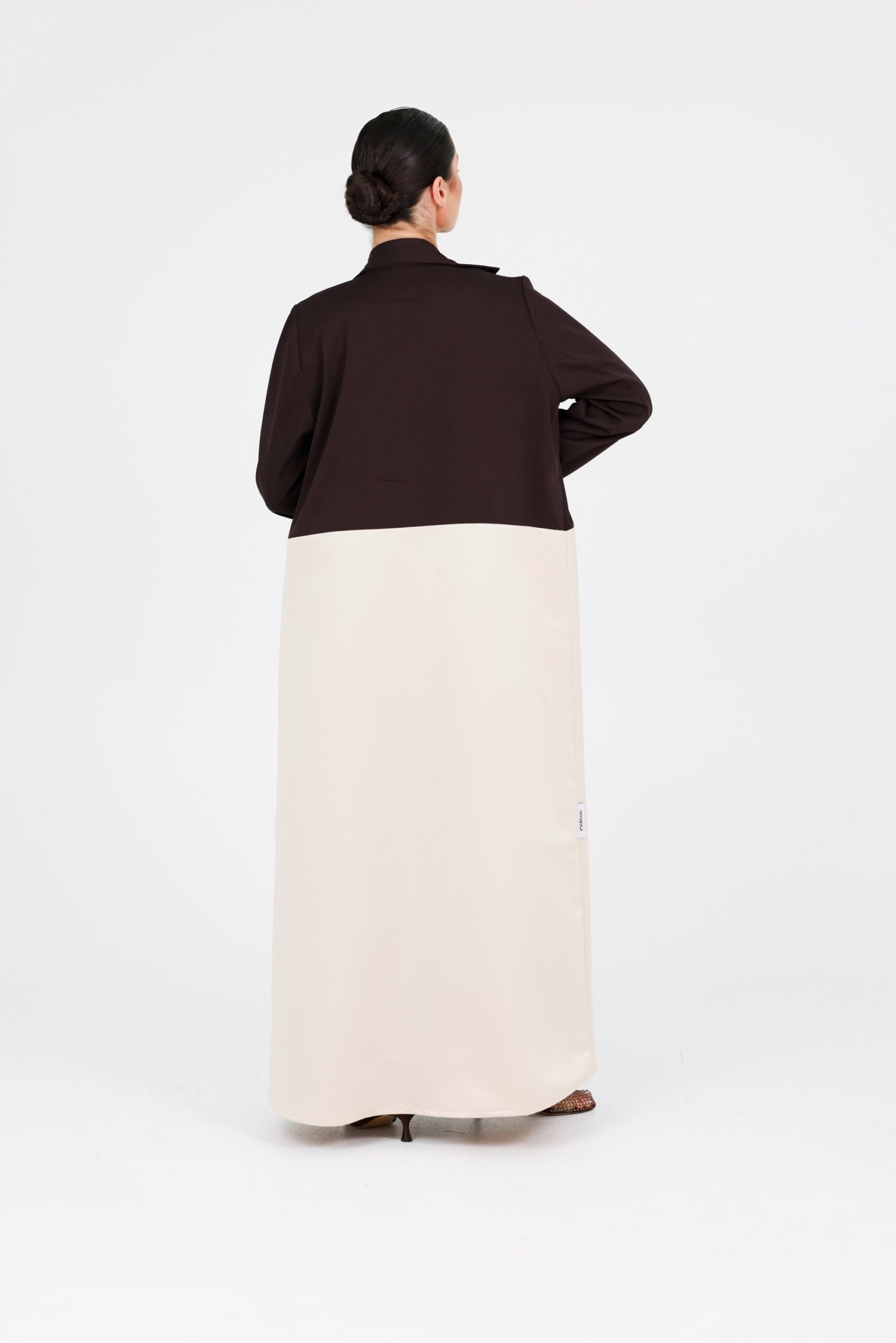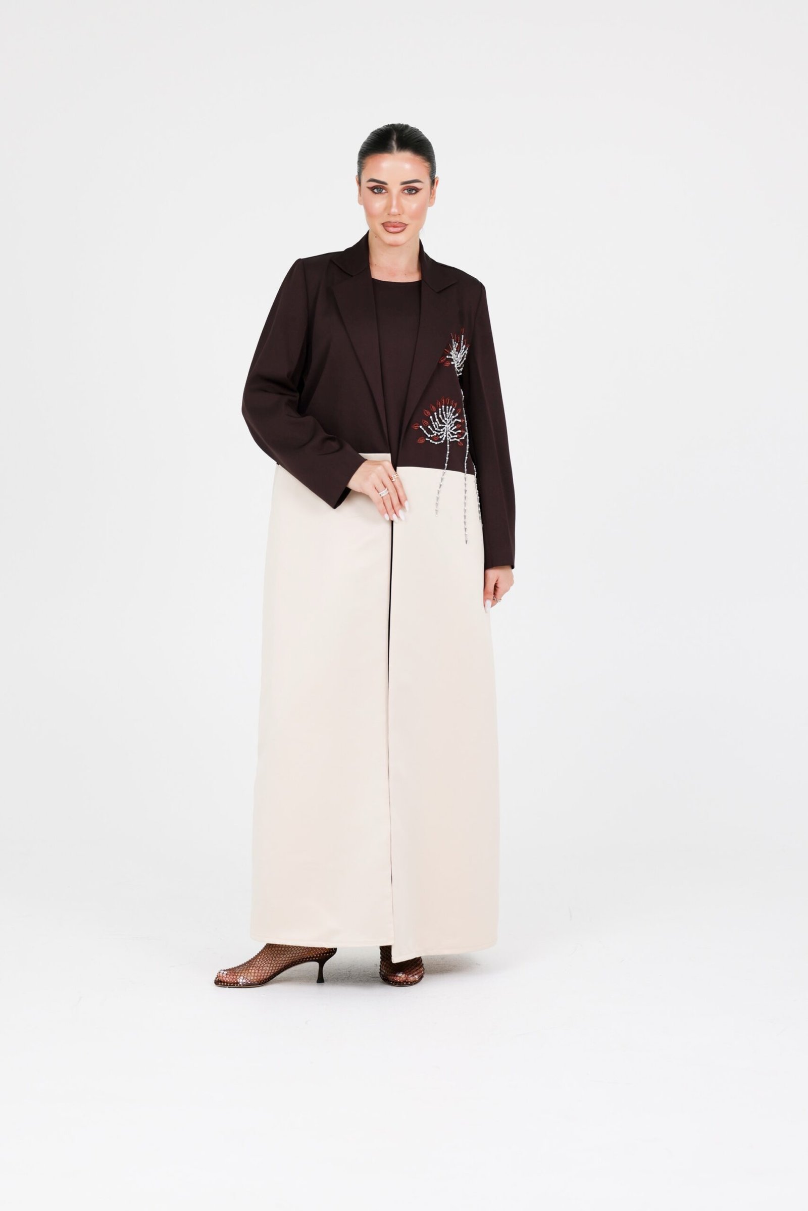 A sophisticated two-tone abaya crafted from luxurious bridal fabric, featuring a refined contrast between rich brown and soft beige tones. The design is enhanced with intricate handcrafted embroidery inspired by delicate botanical elements, adding an elegant artistic touch.