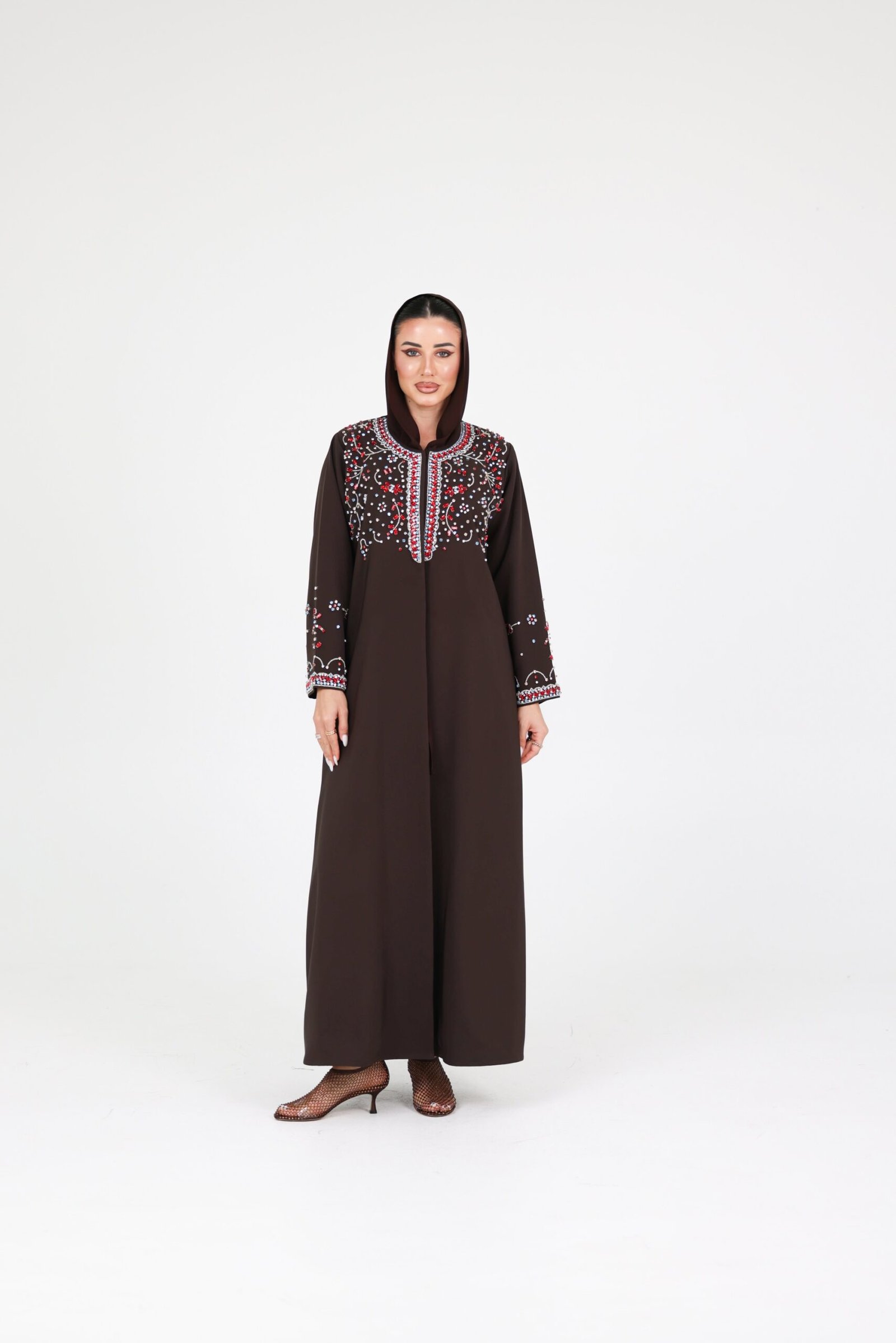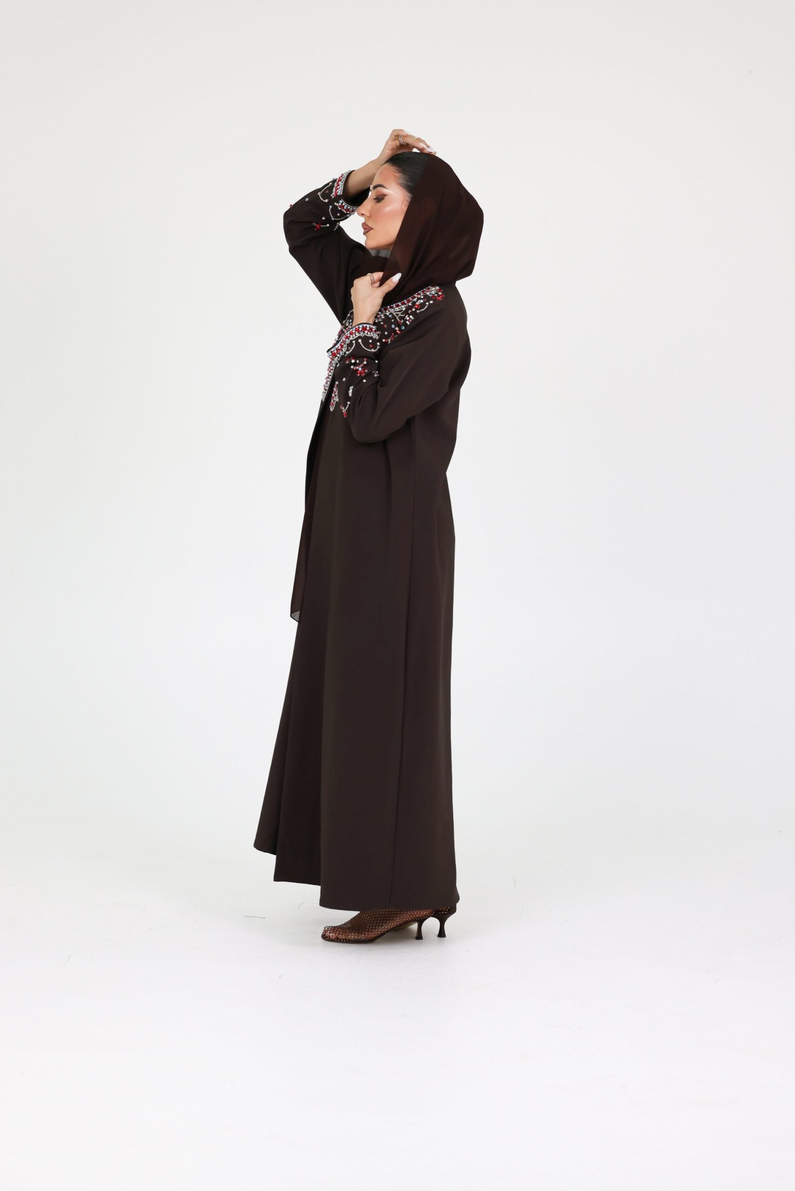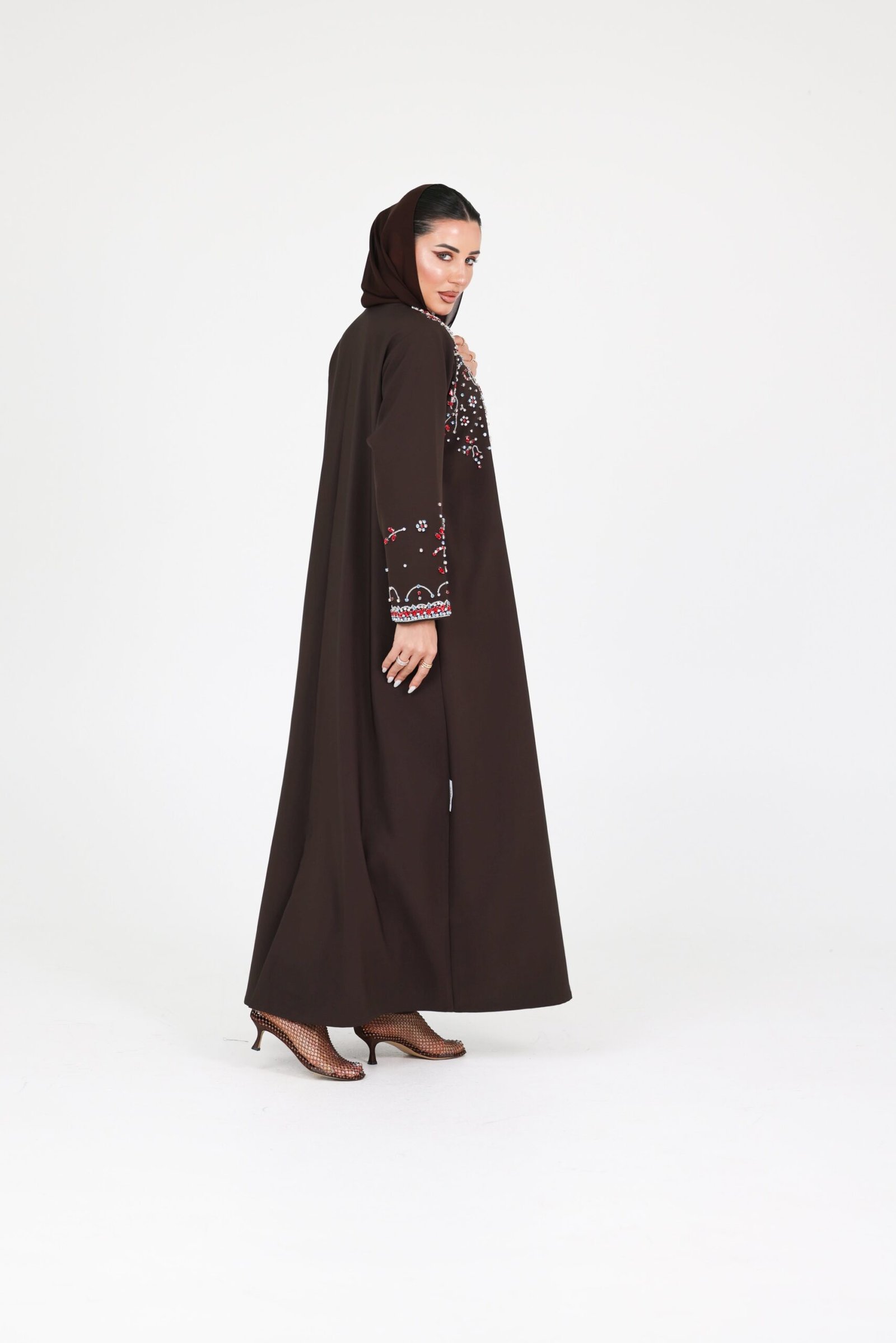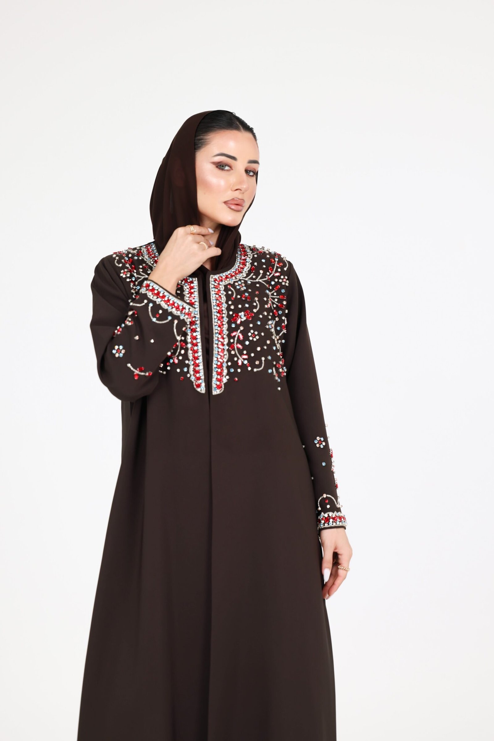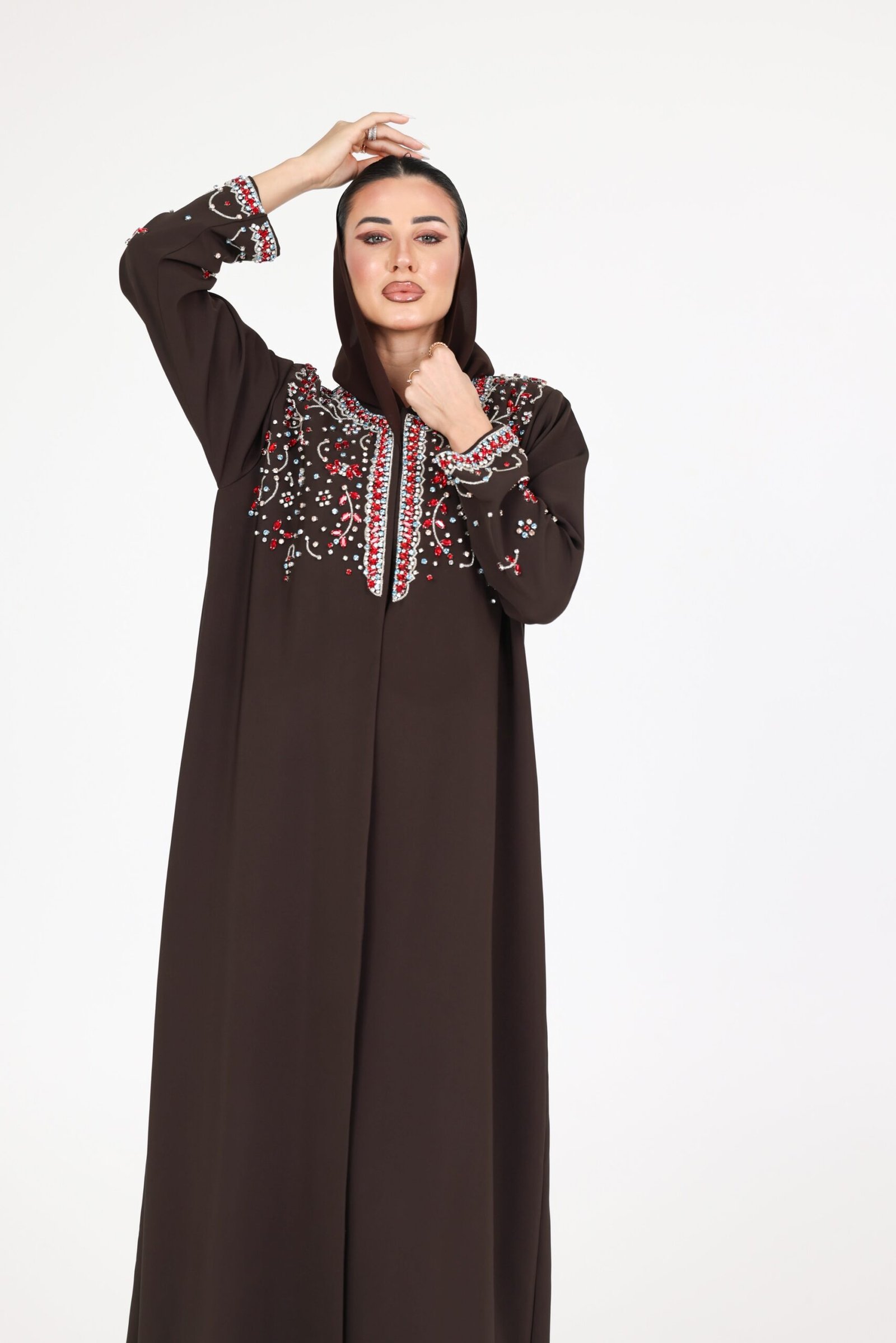 A striking expression of luxury and refined craftsmanship, this piece is designed to capture attention with effortless elegance. Crafted from premium crepe fabric, the abaya flows with a smooth, structured drape that enhances its sophisticated silhouette.