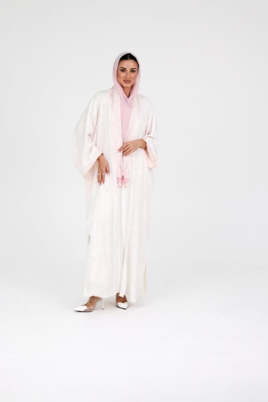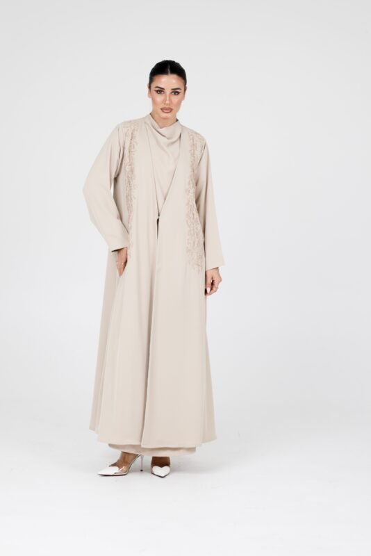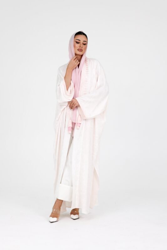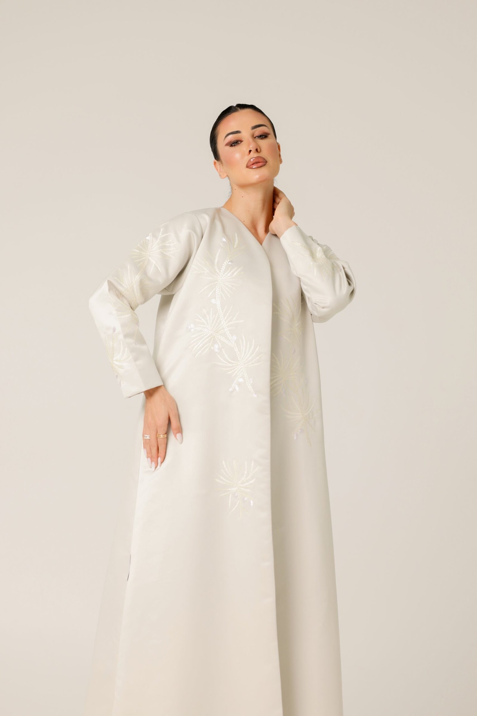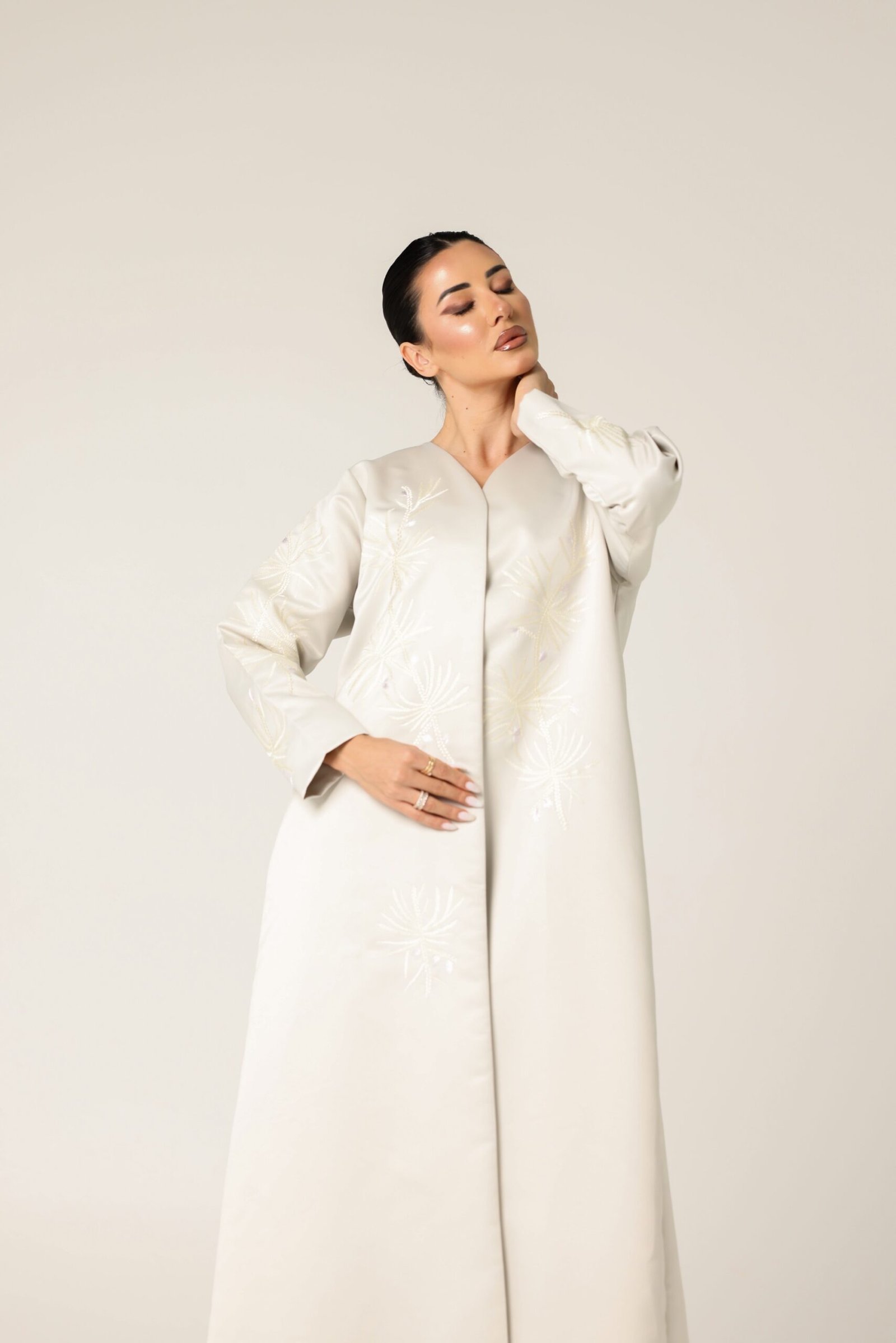A soft and refined design crafted from luxurious bridal fabric, featuring delicate embroidery in beautifully blended tones of light lilac, off-white, and soft beige. The subtle detailing adds a graceful and feminine touch, creating an effortlessly elegant look.