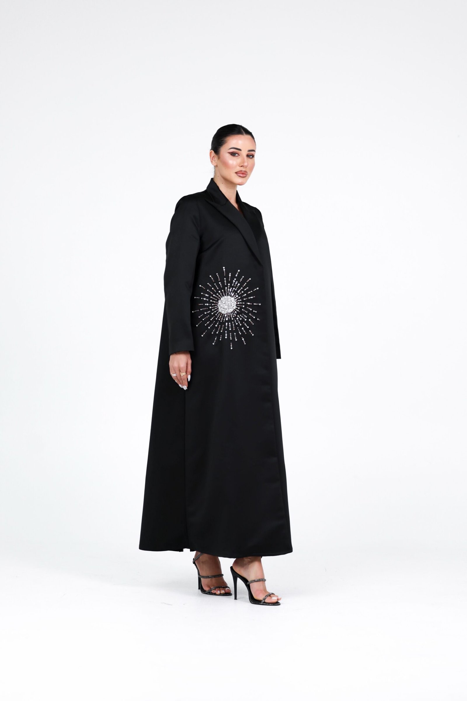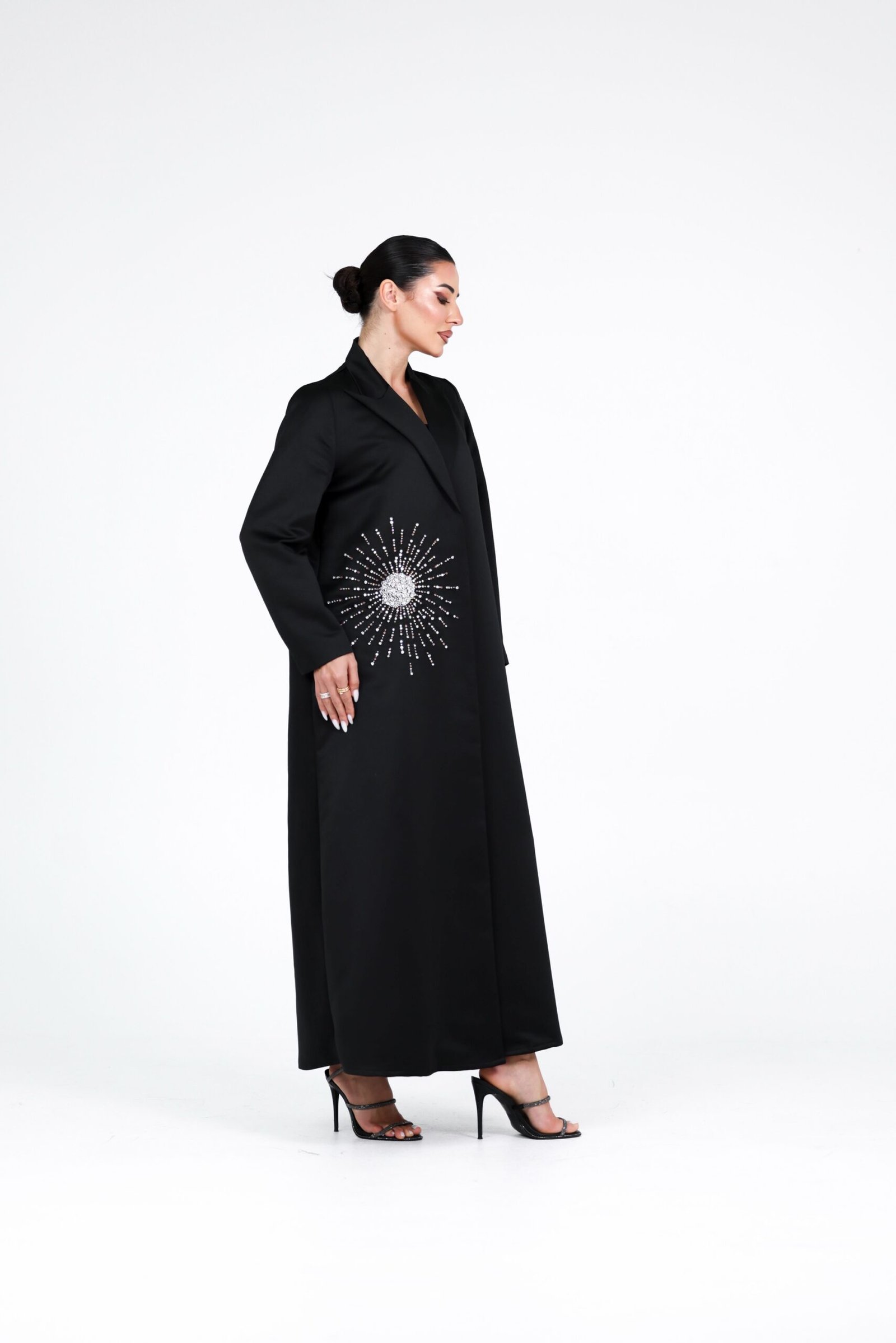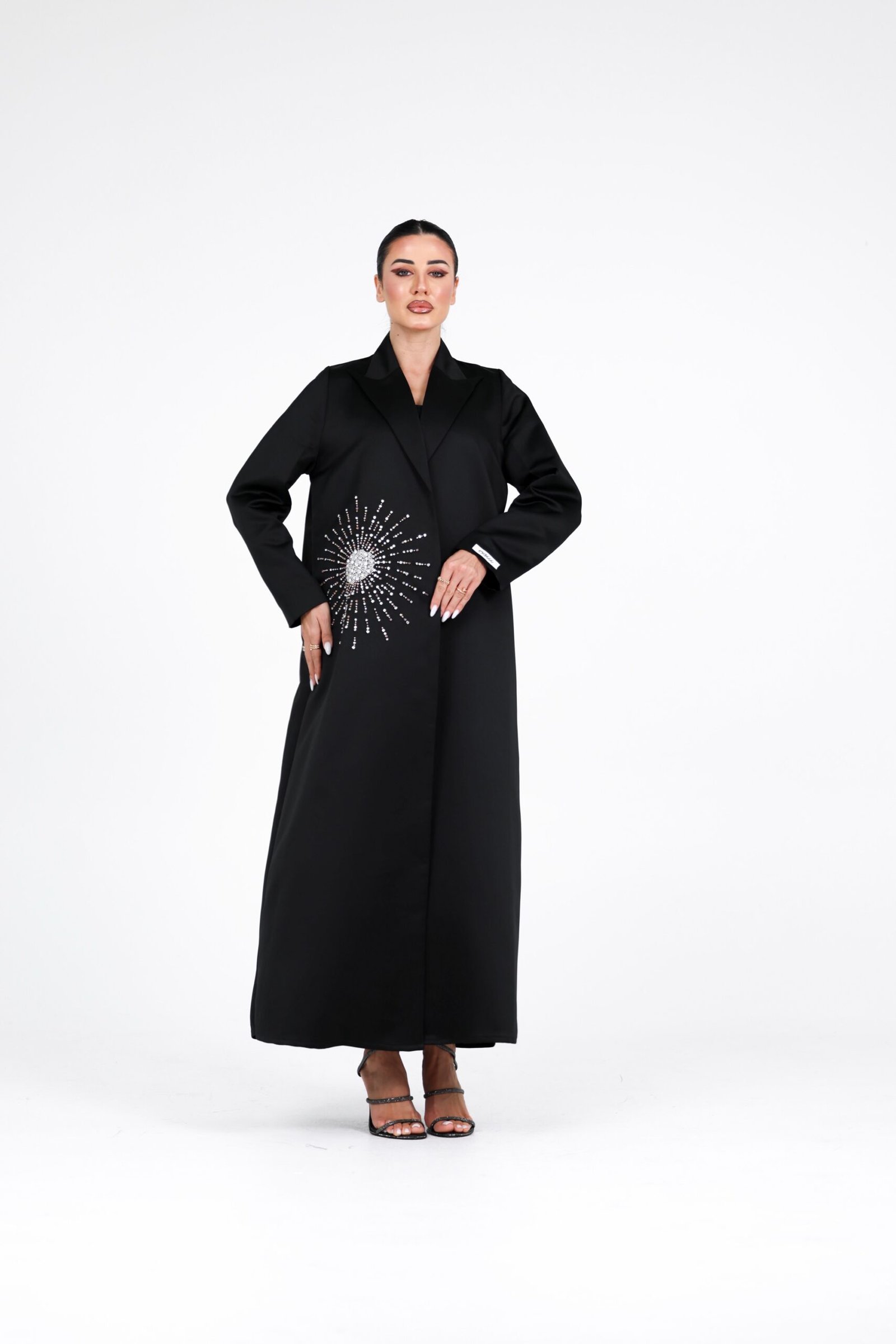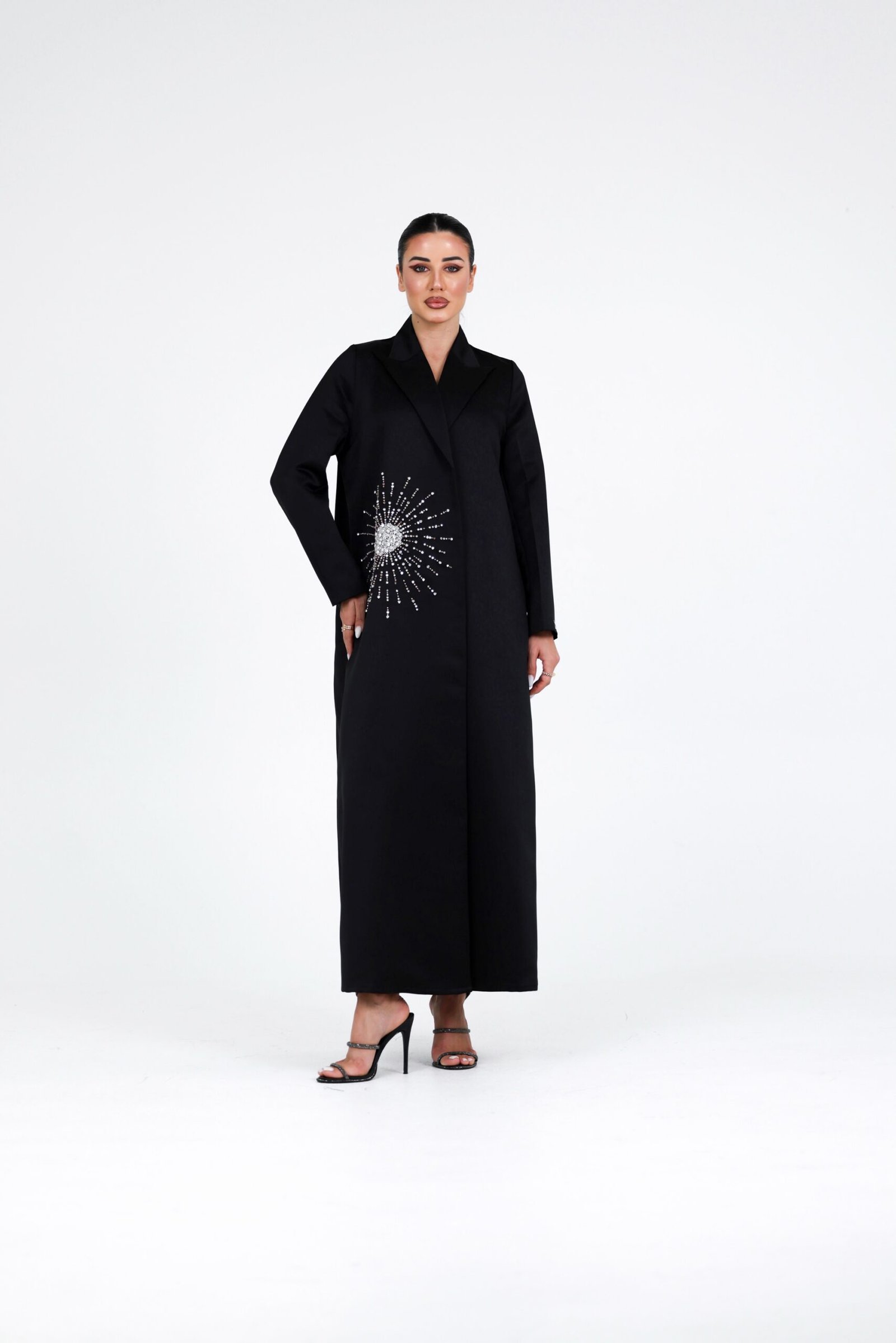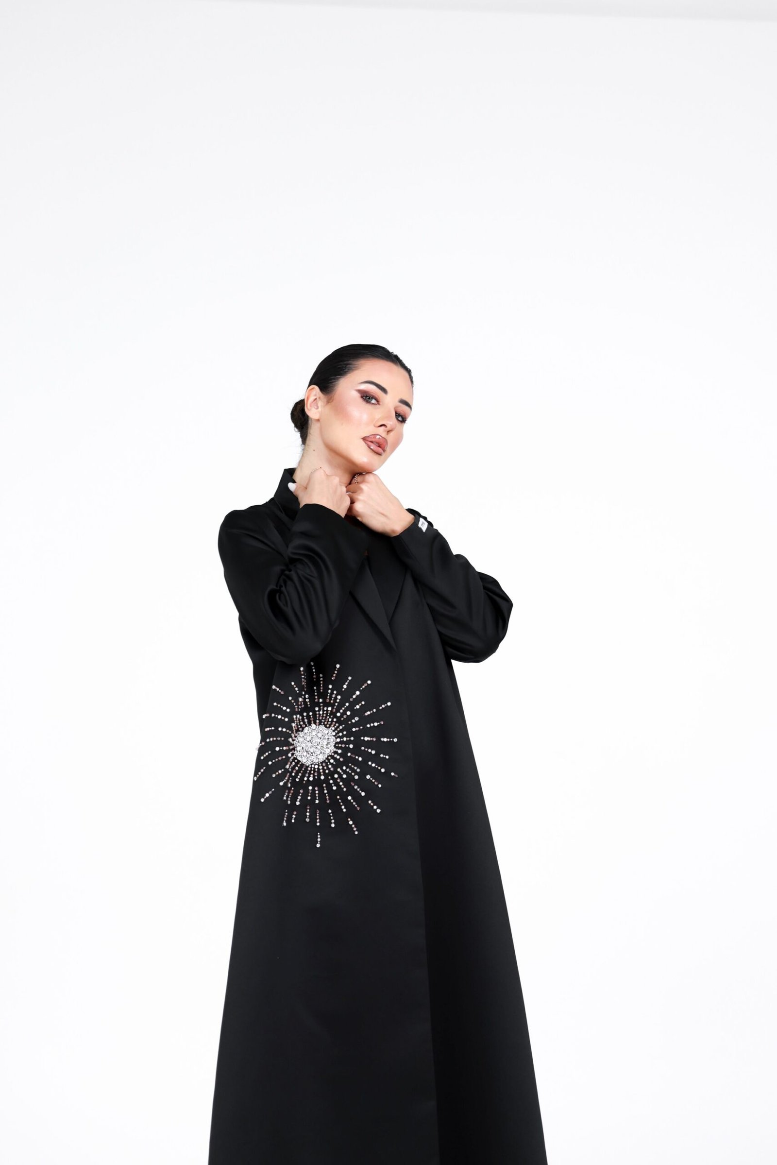 A luxurious coat-style design crafted from premium bridal fabric, offering a rich, structured silhouette with a refined smooth finish. The highlight of this piece is the striking hand-embellished crystal detailing, designed in a radiant burst pattern that adds a bold yet elegant statement.