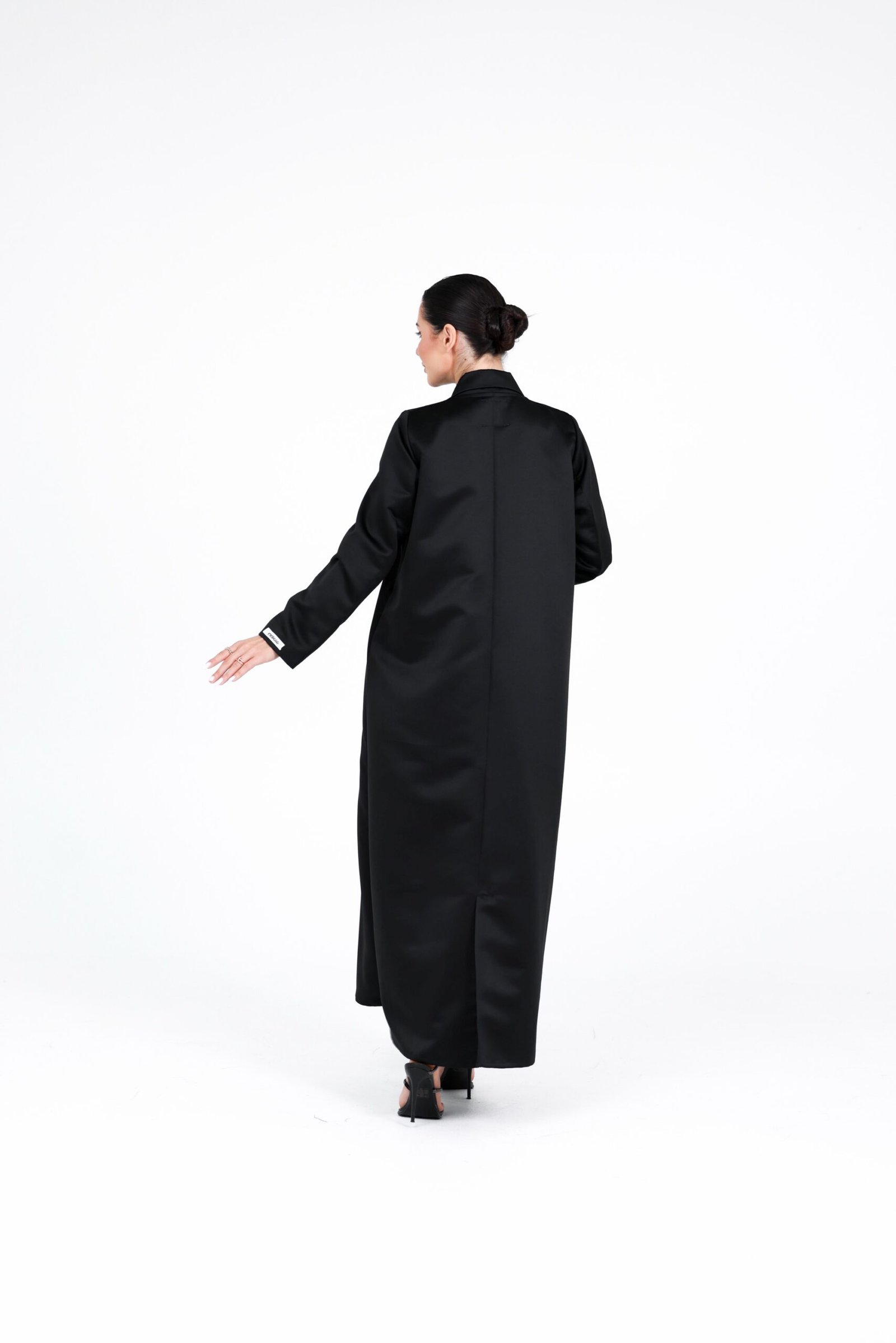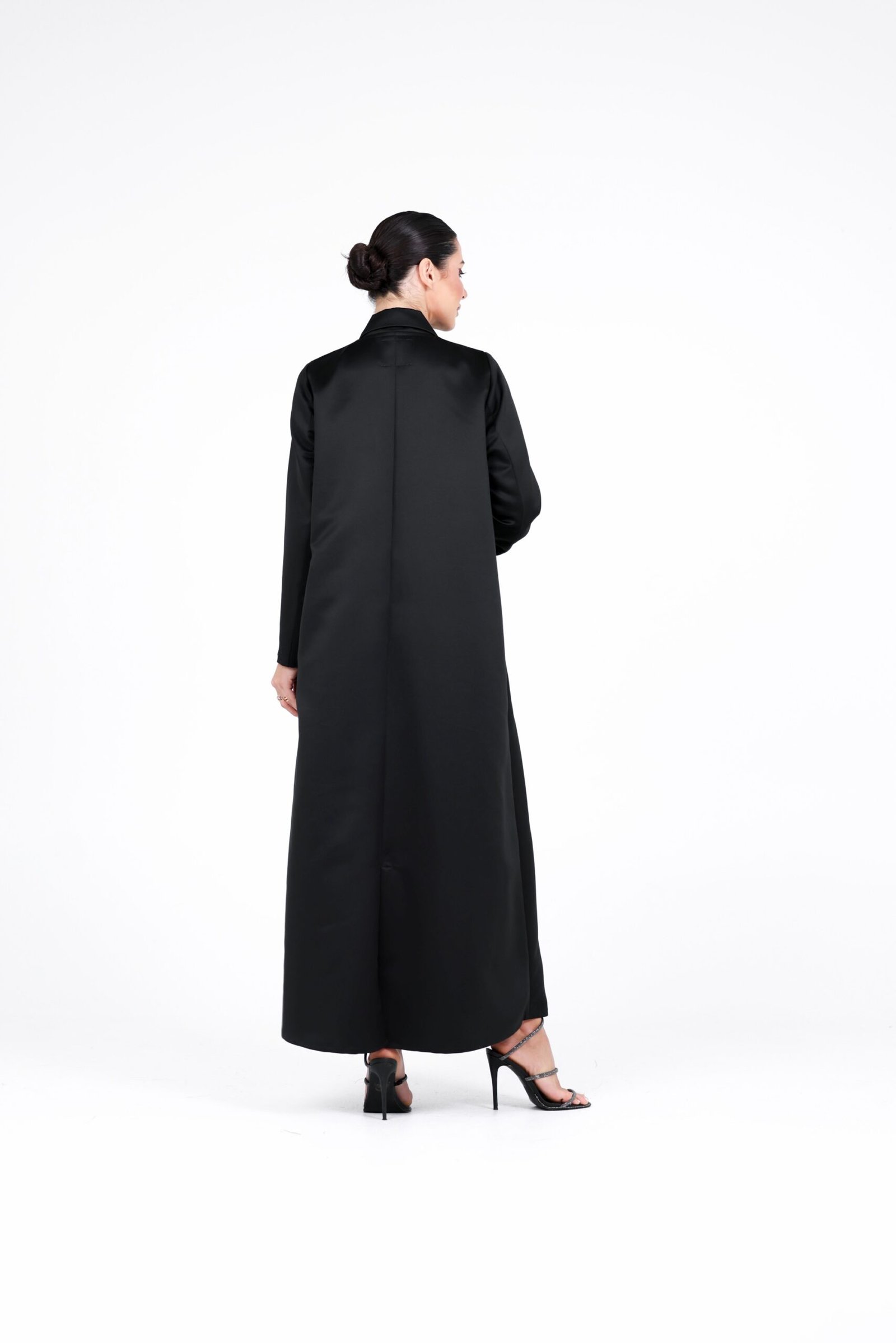 The clean cut, sharp tailoring, and subtle shine of the fabric create a perfect balance between modern sophistication and timeless glamour. This piece is designed for those who appreciate standout details with a polished, minimal base.