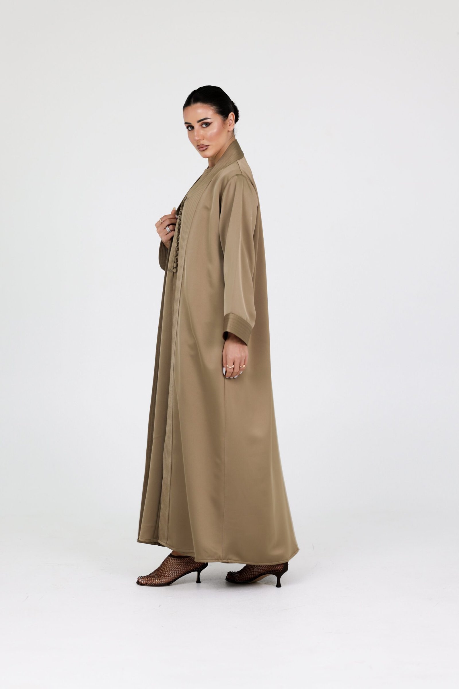 A sophisticated abaya designed with a clean layered silhouette, paired with an intricately detailed inner dress that adds depth and character to the overall look. The front features subtle linear elements, while the inner piece is finished with delicate button detailing and refined stitching that elevate the design.