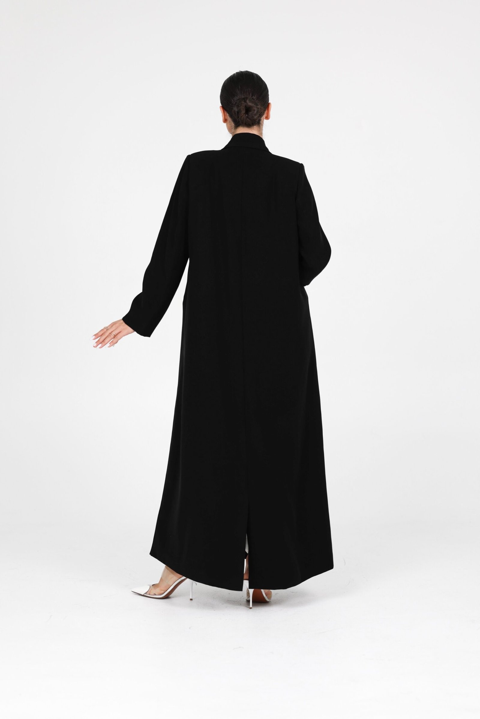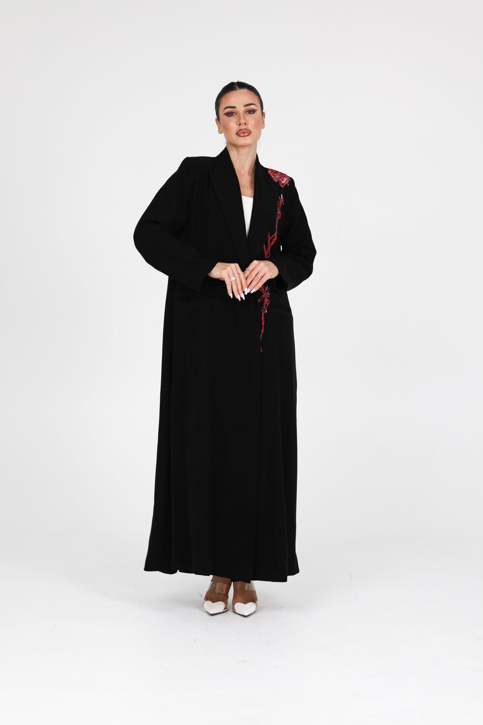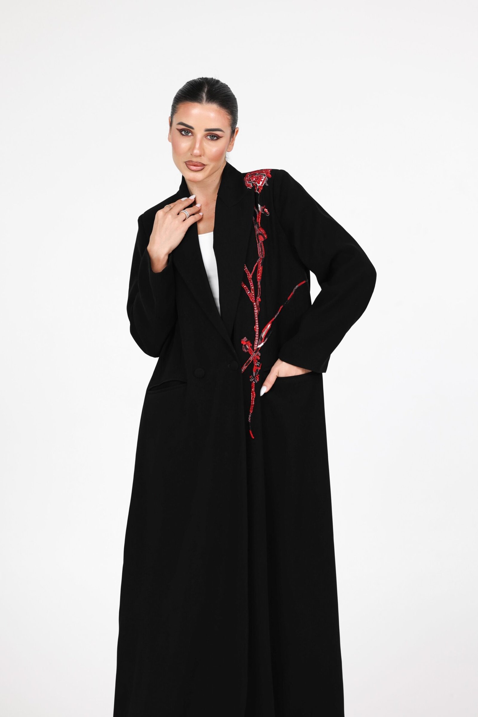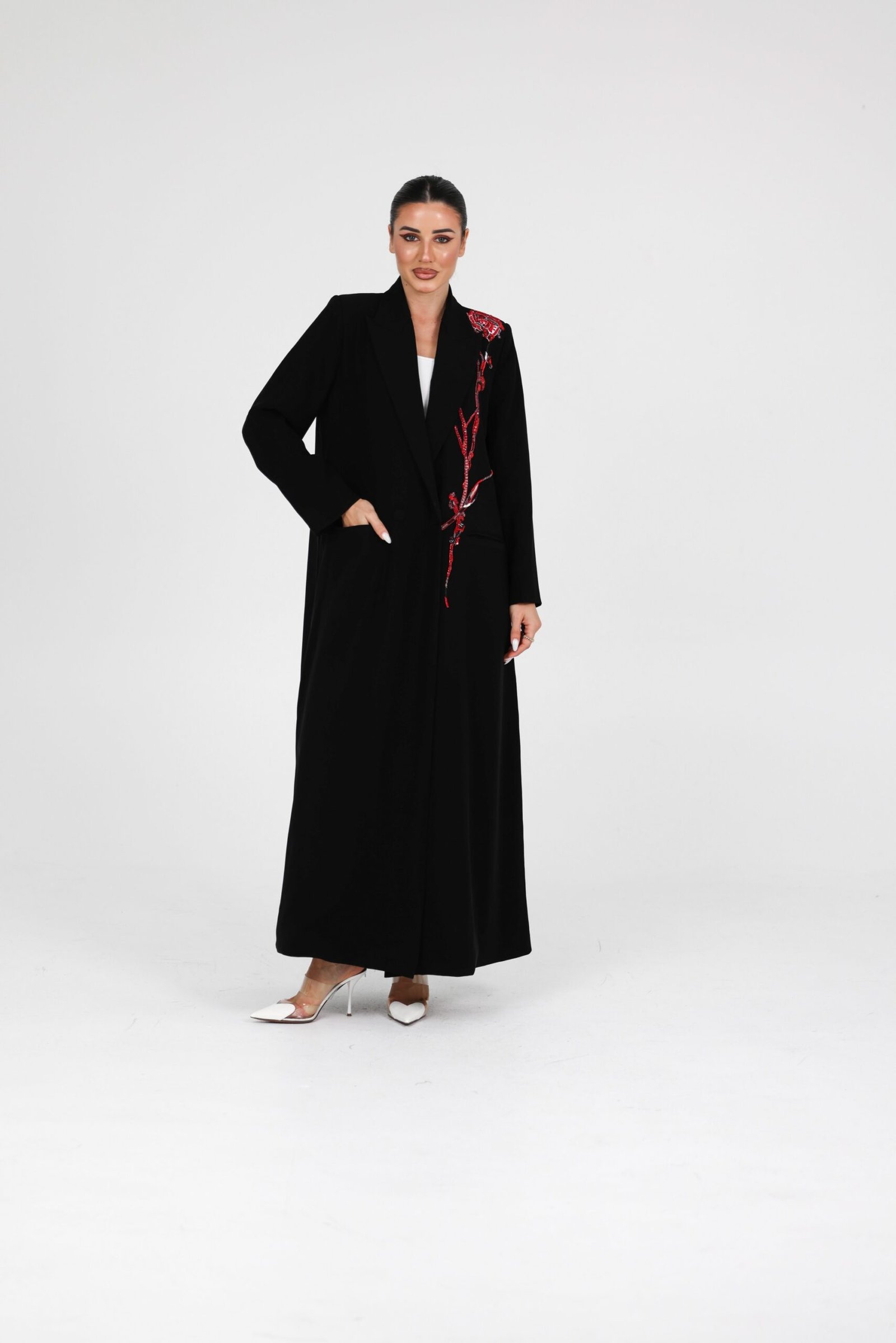 A statement coat-style abaya designed with a structured silhouette and fully lined interior, offering both elegance and comfort. The piece is elevated with intricate handcrafted embroidery inspired by a cascading rose detail flowing from the shoulder, creating a bold yet refined visual statement.