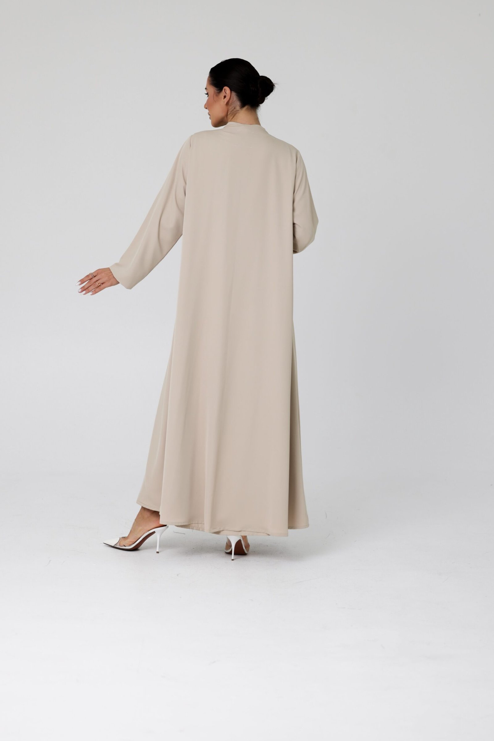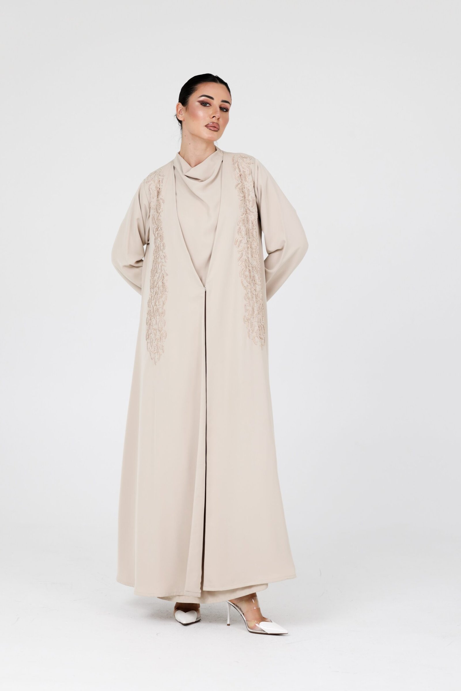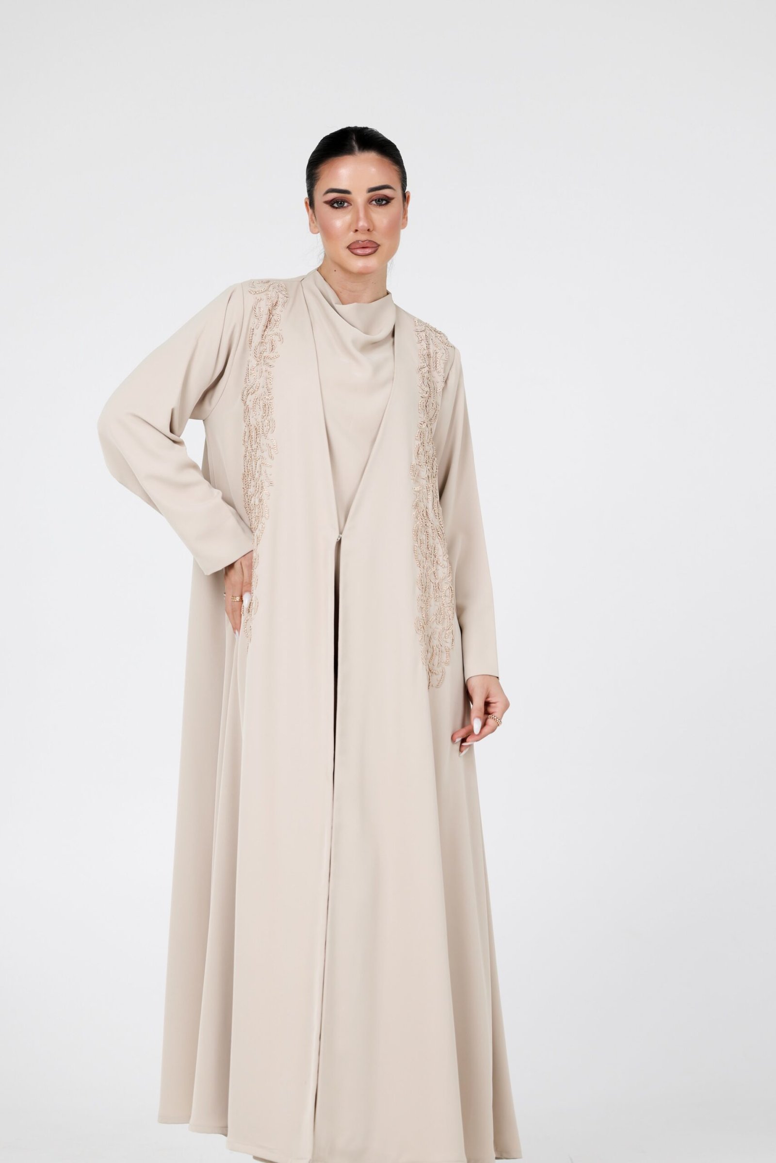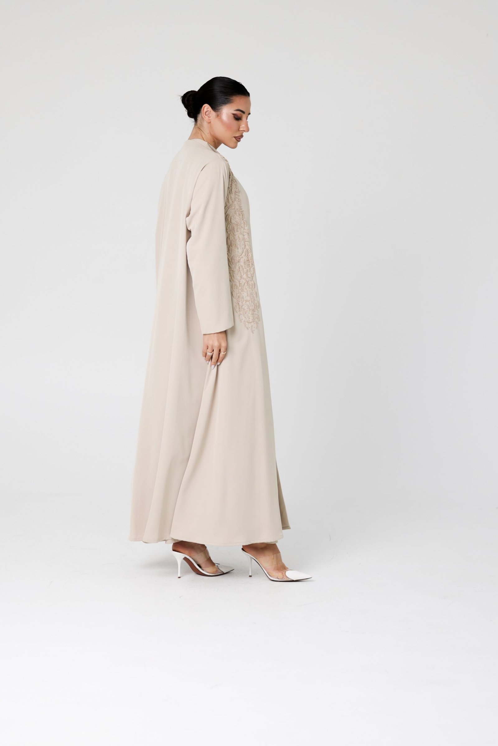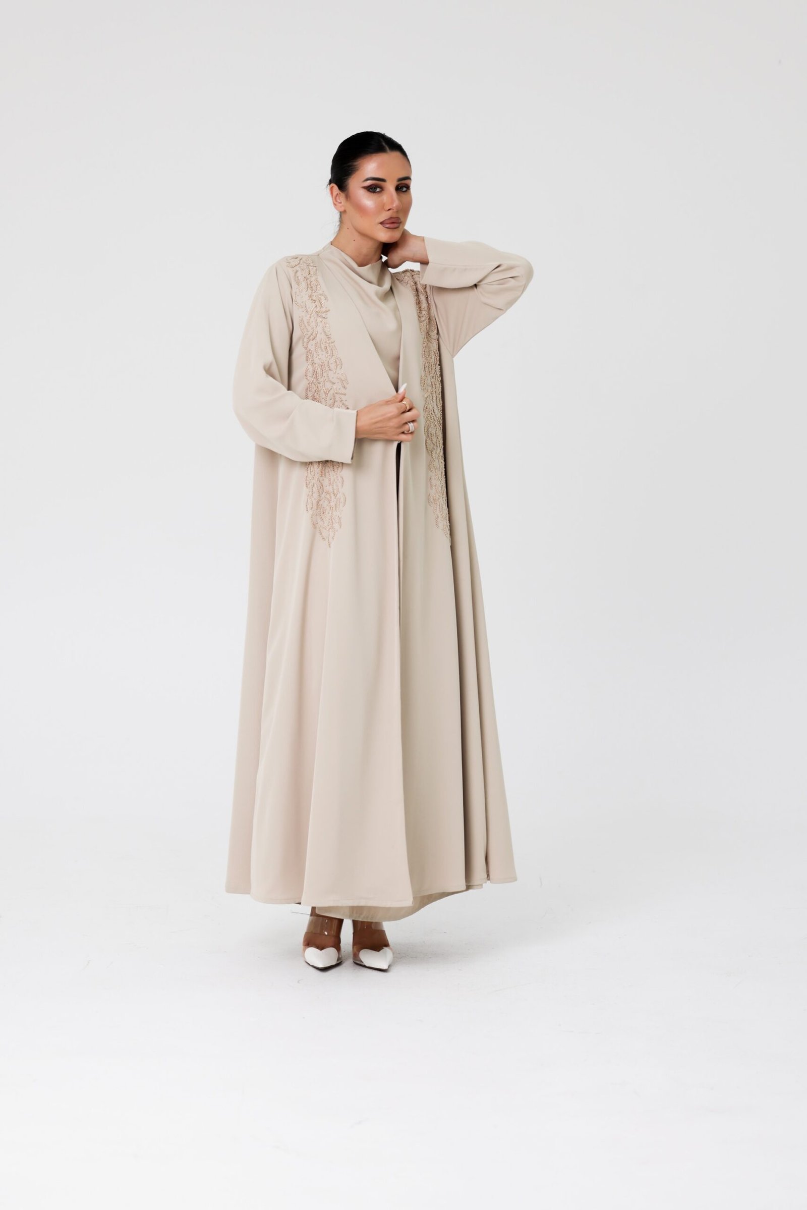 A refined beige abaya featuring delicate handcrafted embroidery along the front panels, designed to reflect subtle elegance and timeless style. The soft, flowing silhouette offers a graceful and sophisticated look, perfect for everyday wear and polished daytime occasions.